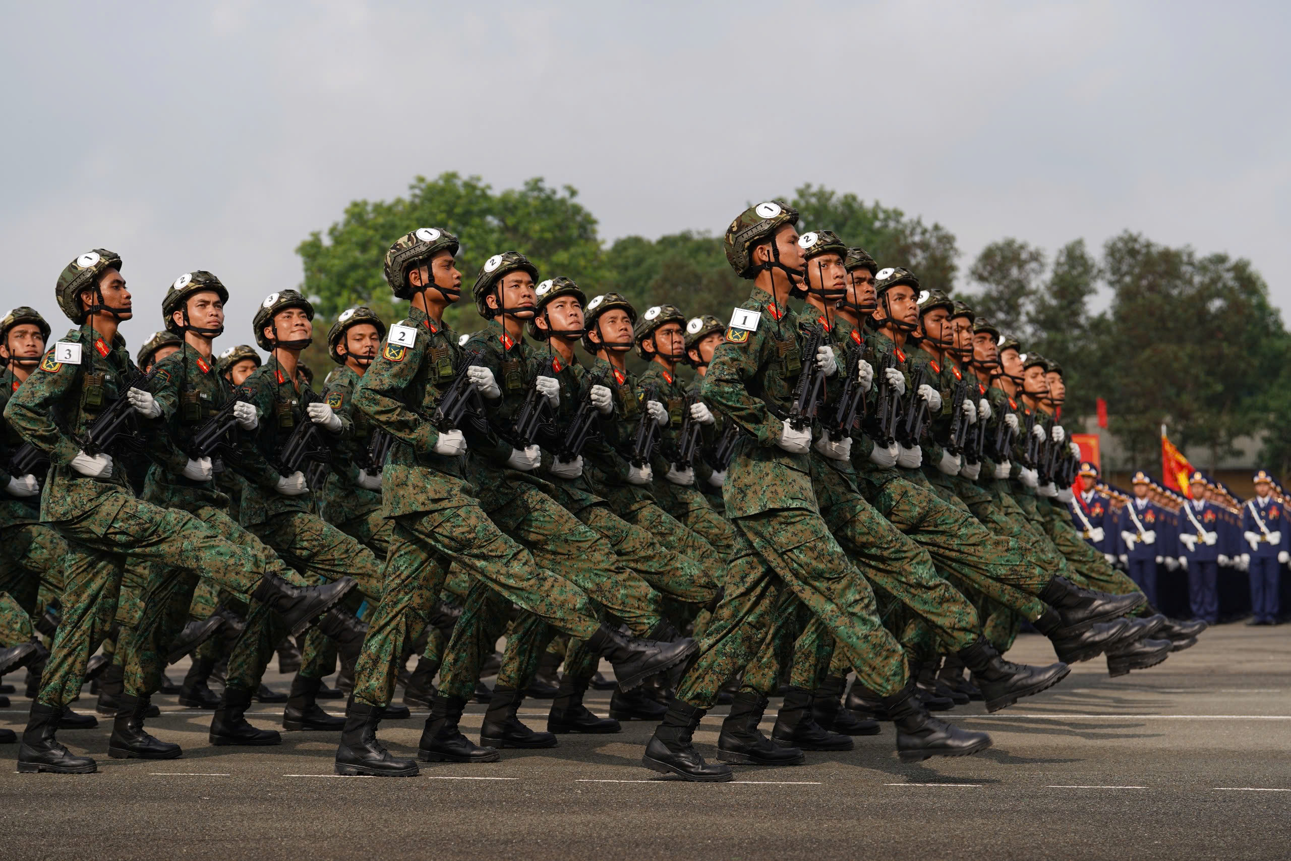 Các hướng đó gồm: Nam Kỳ Khởi Nghĩa – Lê Lợi – Nguyễn Thị Nghĩa – Ngã 6 Phù Đổng – Cách Mạng Tháng 8, tập kết tại Công viên Tao Đàn; Nam Kỳ Khởi Nghĩa – Lê Thánh Tôn – Nguyễn Huệ – Vòng xoay Mê Linh, tập kết tại Bến Bạch Đằng; Lê Duẩn – Nam Kỳ Khởi Nghĩa – Nguyễn Đình Chiểu – Đinh Tiên Hoàng, tập kết tại Sân vận động Hoa Lư; Nam Kỳ Khởi Nghĩa – Hai Bà Trưng, tập kết tại Công viên Lê Văn Tám. Trong ảnh, các lực lượng đang tập luyện để diễu binh tại Biên Hòa, Đồng Nai.