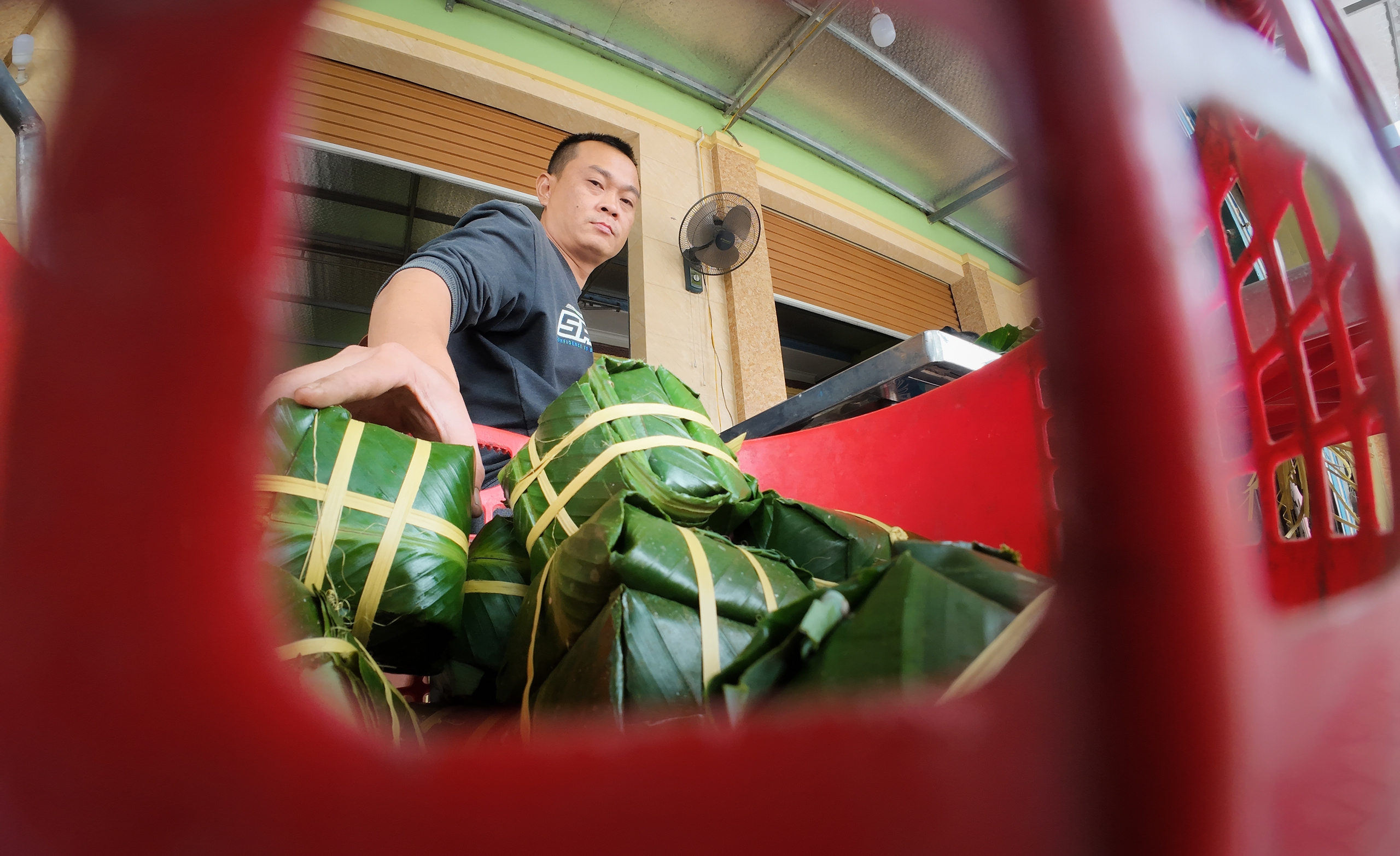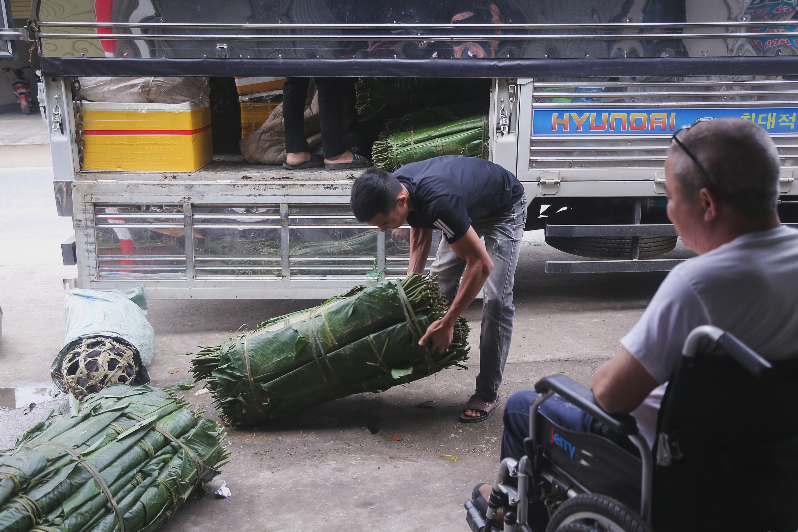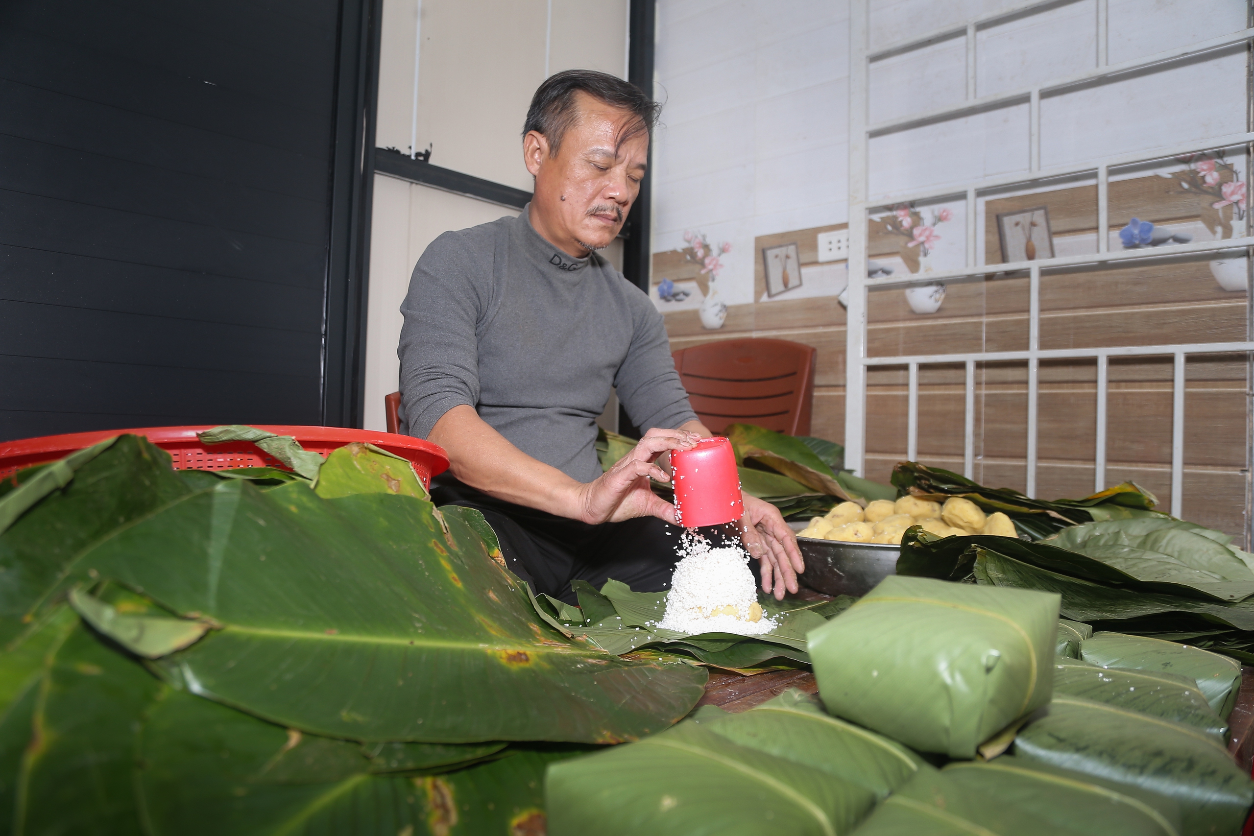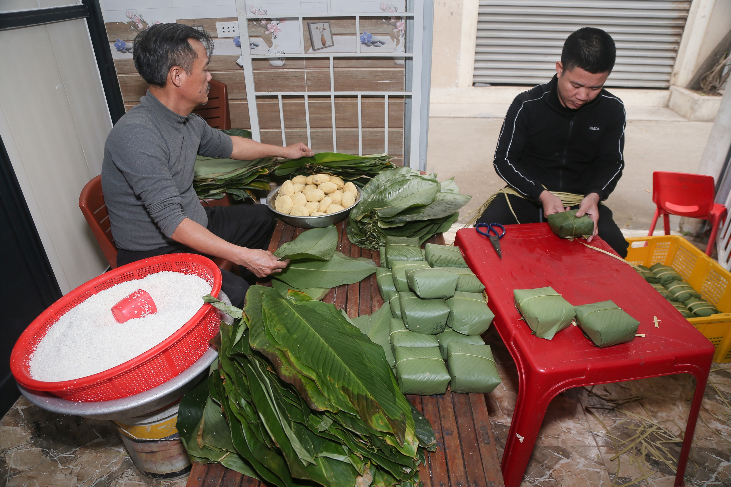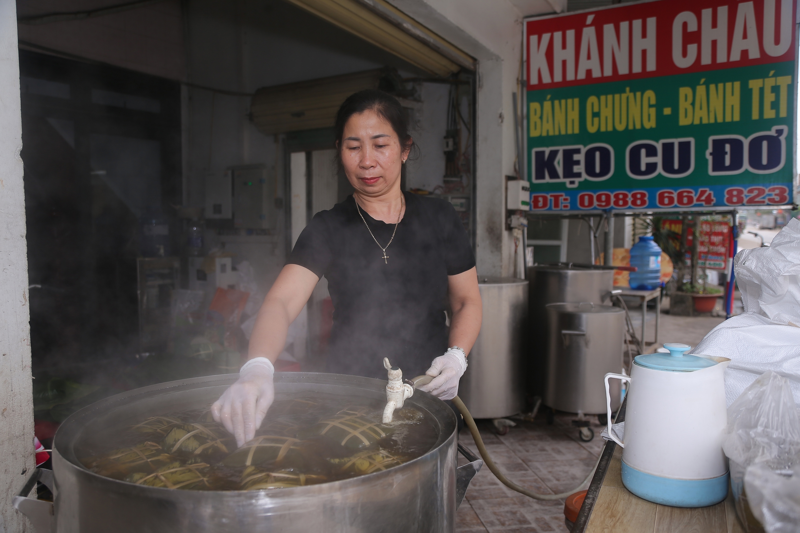 Cách đó không xa, tại cơ sở bánh chưng Khánh Châu cũng tấp nập, nhộn nhịp không kém. Anh Trần Quốc Khánh (54 tuổi, chủ cơ sở này) cho biết, đến nay cơ sở nhà anh đã phải nhập 50.000 lá dong để làm bánh vụ Tết. Cơ sở làm đến 28 Tết mới nghỉ.