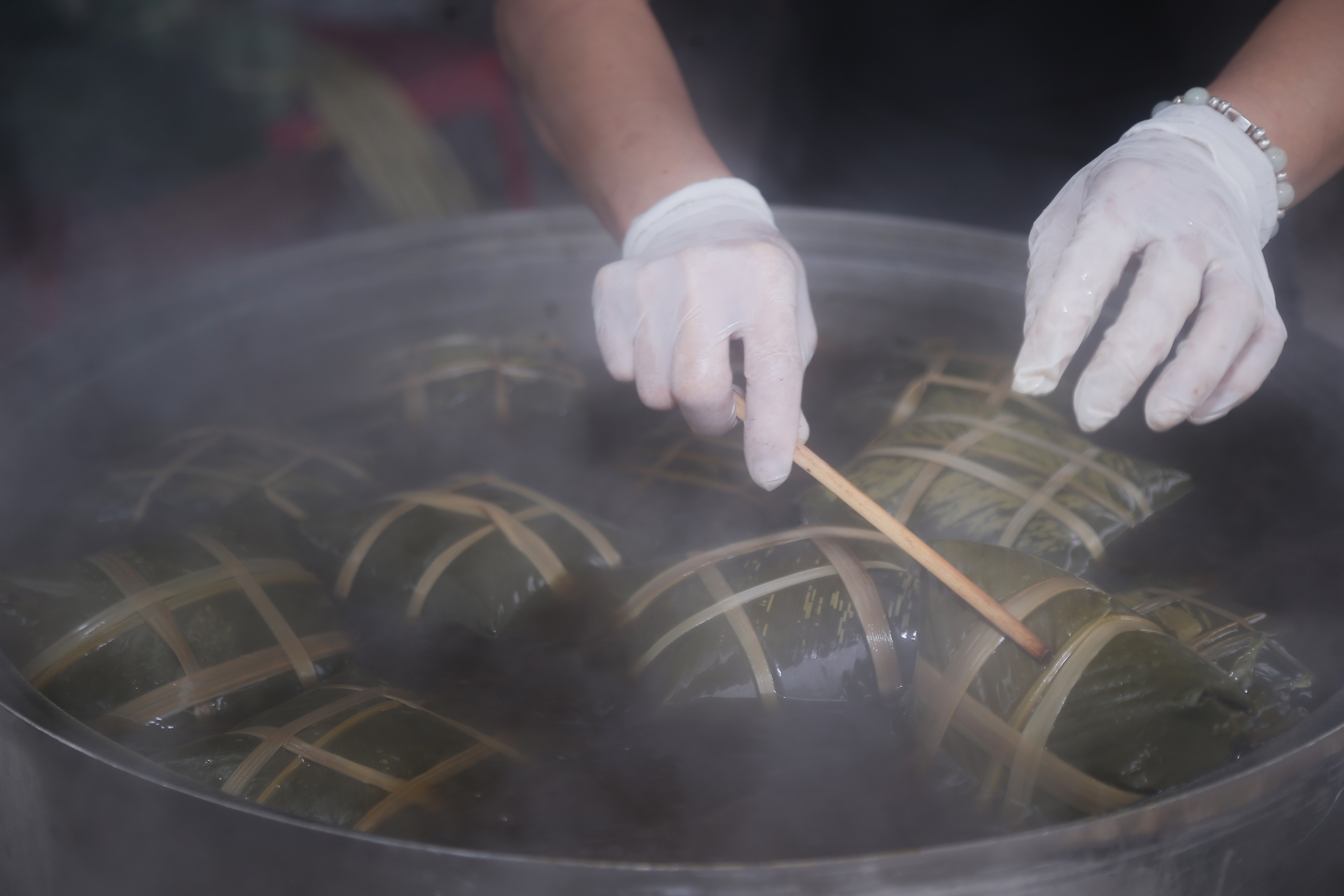 Tại các cơ sở sản xuất, người cắt lá, người vo nếp, người làm nhân, người gói, người luộc bánh... tạo thành một dây chuyền khép kín sản xuất ra hàng nghìn chiếc bánh mỗi ngày. Hàng chục bếp điện khói bốc lên nghi ngút, mùi bánh chưng vừa nấu thơm phức.