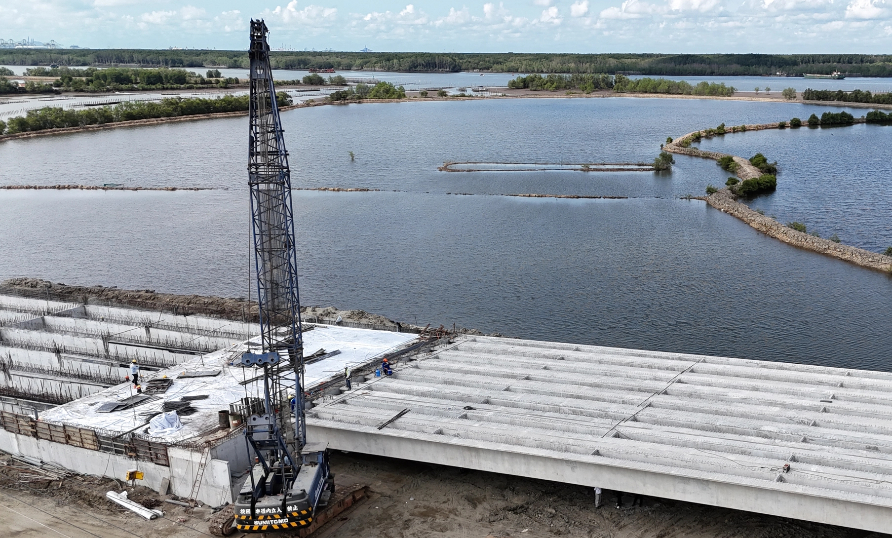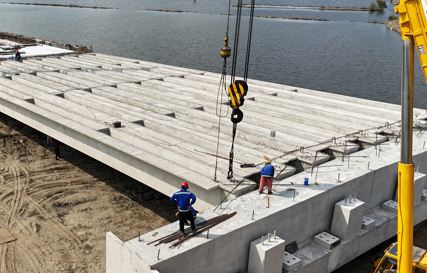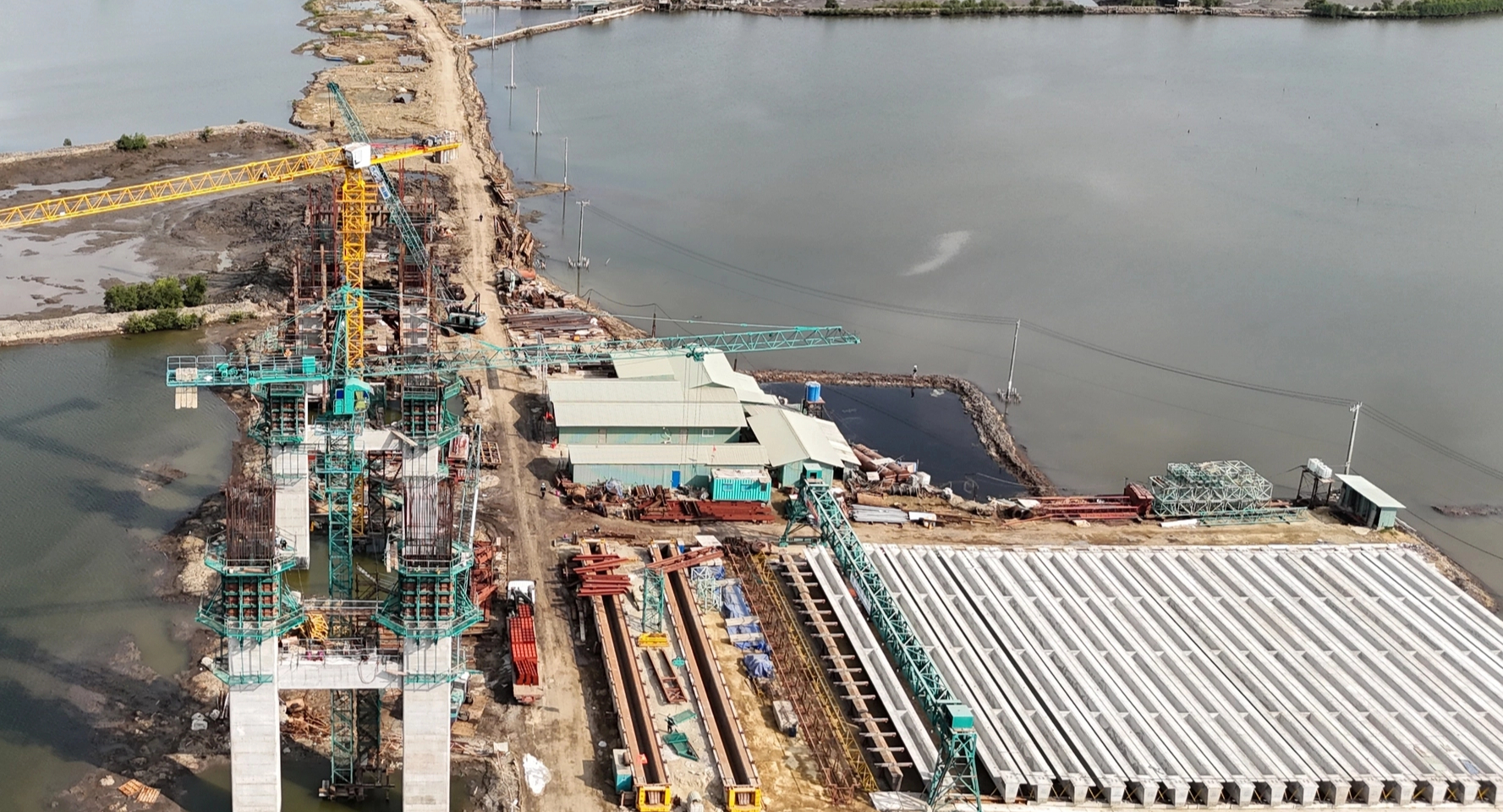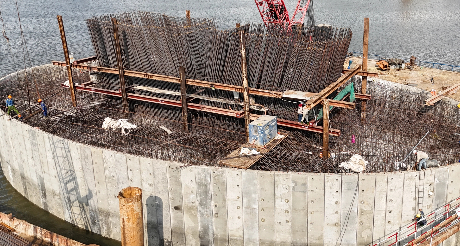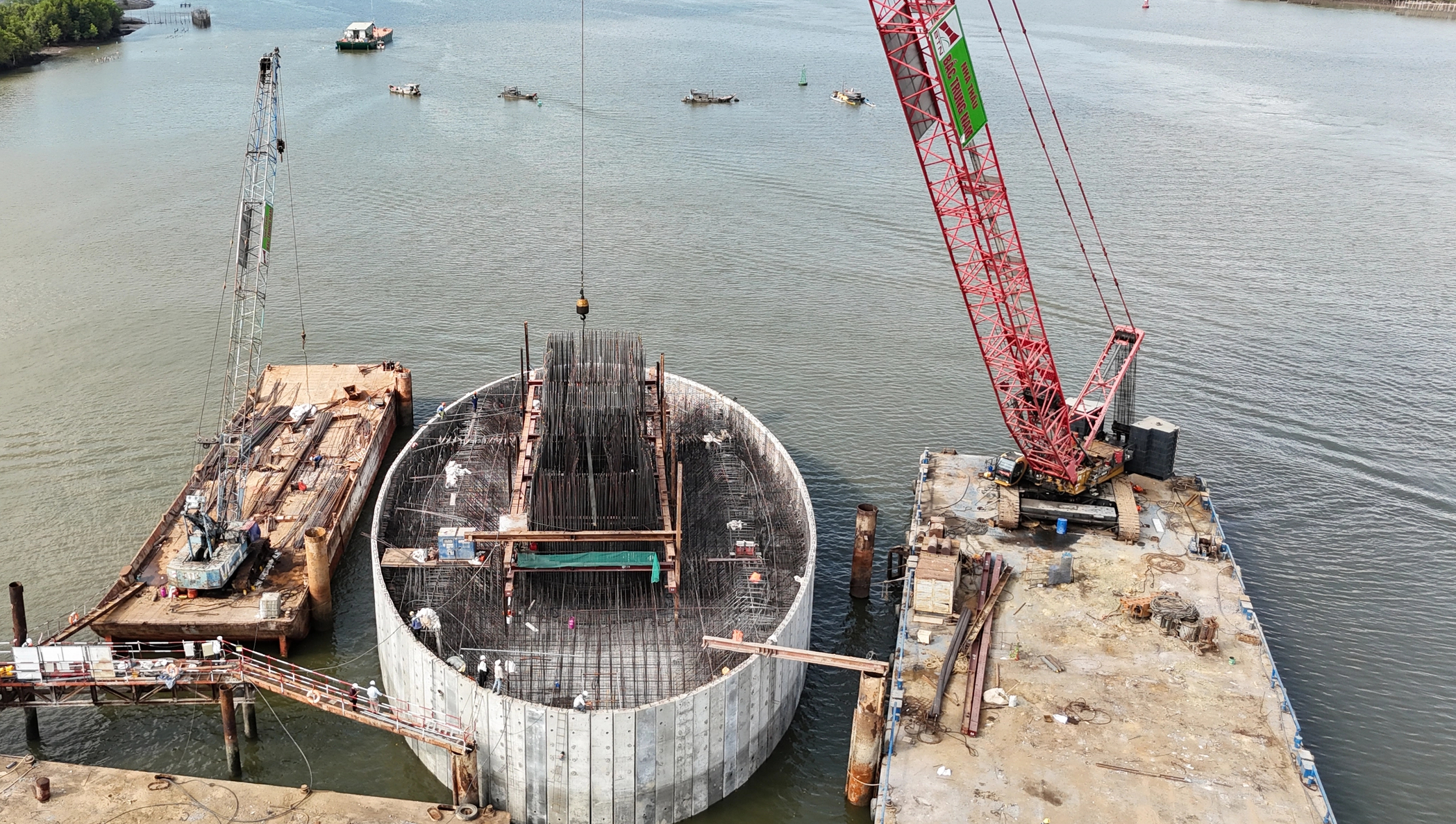 Trên công trường các trụ cầu đang được xây dựng, dần thành hình, nổi lên giữa sông.
