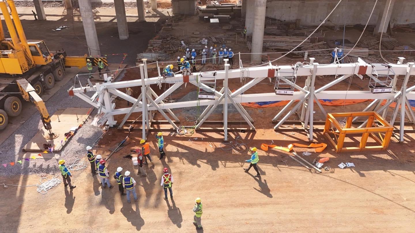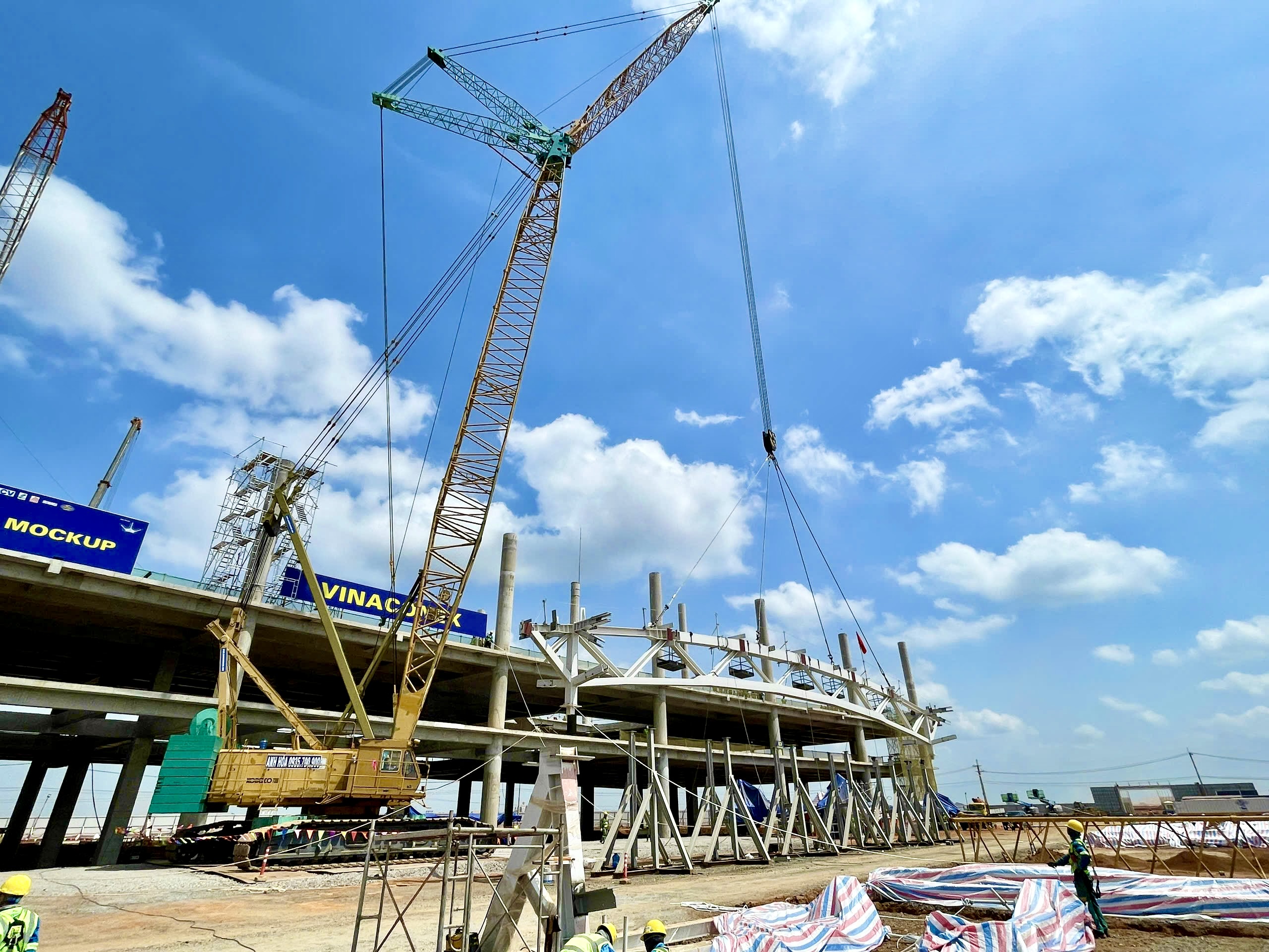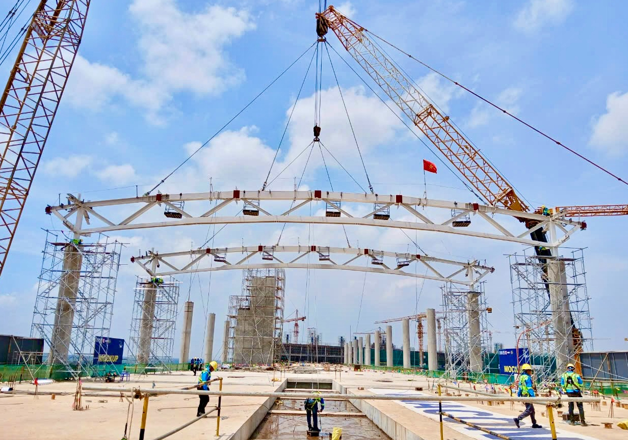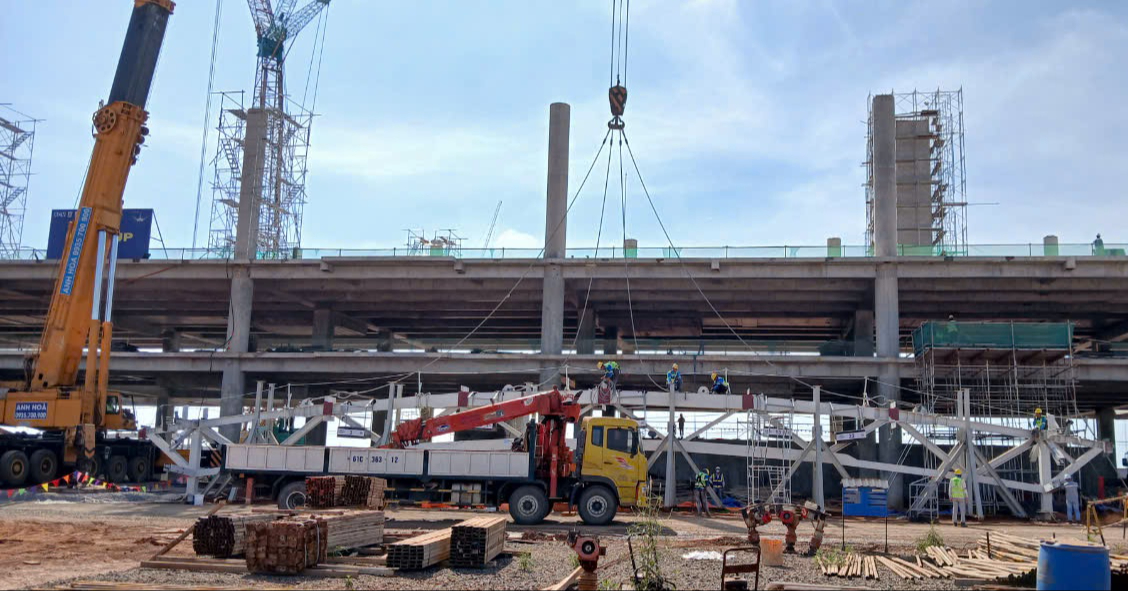 Đây là giai đoạn quan trọng khi liên danh nhà thầu đã cho cất nóc, lắp dựng kết cấu thép mái nhà ga, tạo nên dấu ấn cuối cùng trước khi công trình hoàn thiện.