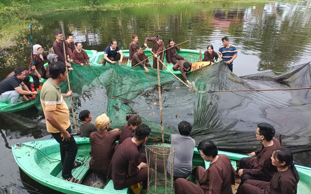 Du khách trải nghiệm kéo lưới bắt cá ở Tràm Chim.