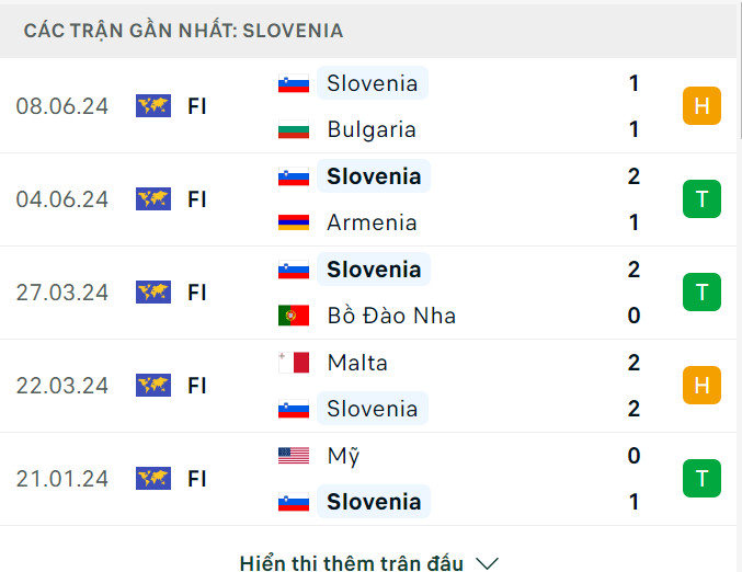 Slovenia đến EURO 2024 với phong độ rất ấn tượng khi bất bại trong 5 trận gần nhất trên mọi đấu trường (thắng 3, hòa 2).