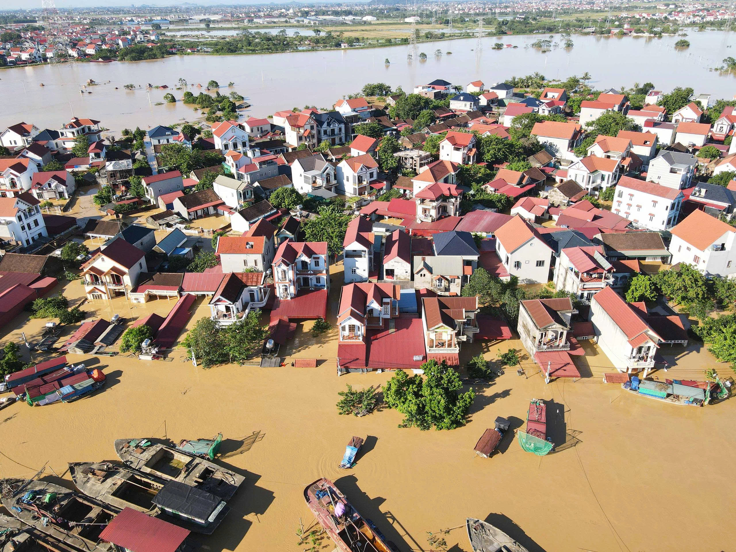 Tại xã Hợp Thịnh, tỉnh Bắc Ninh, nhiều thôn ở ngoài đê sông Cầu đã bị biển nước bao vây, có xóm nước đã ngập gần hết tầng 1 của ngôi nhà.