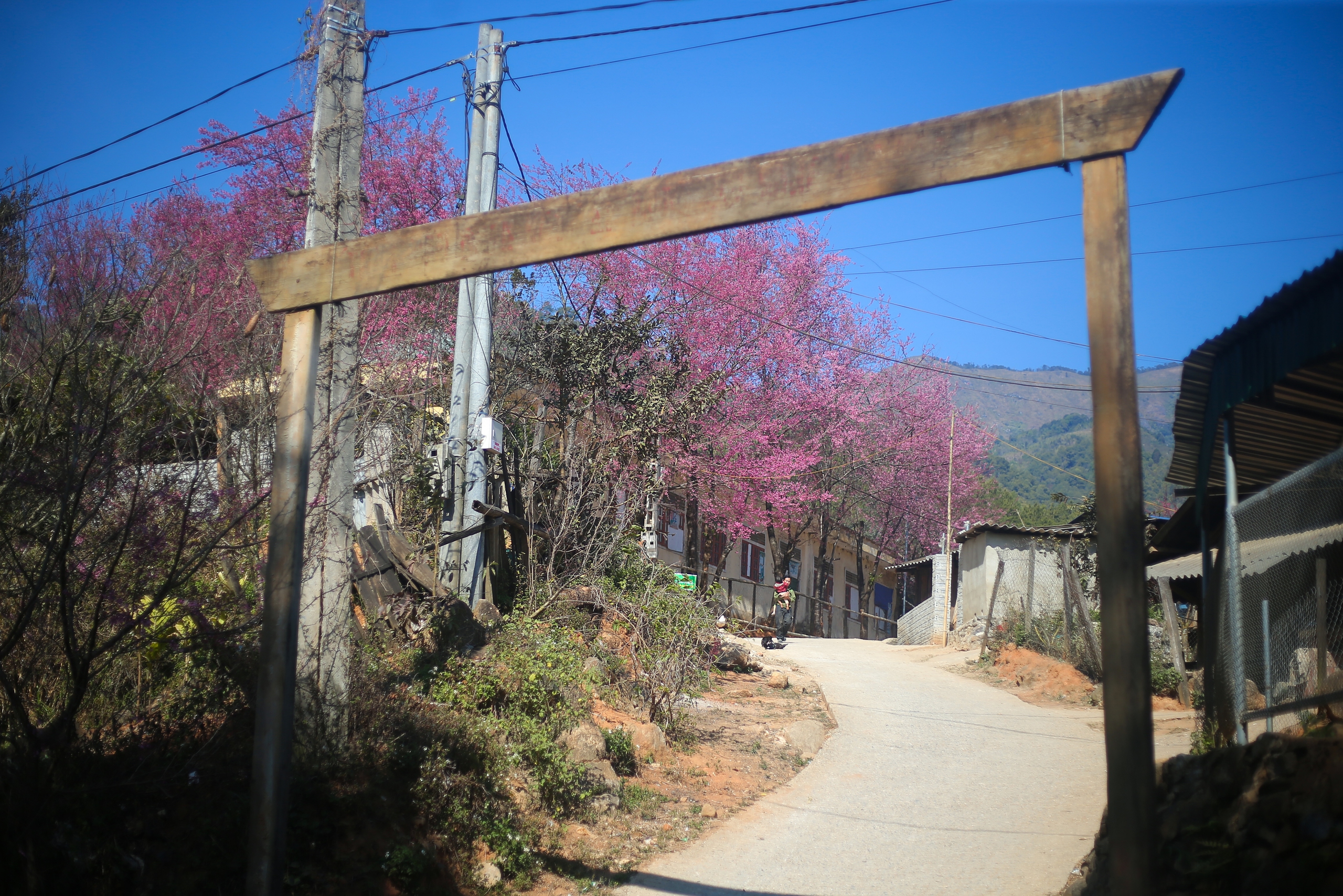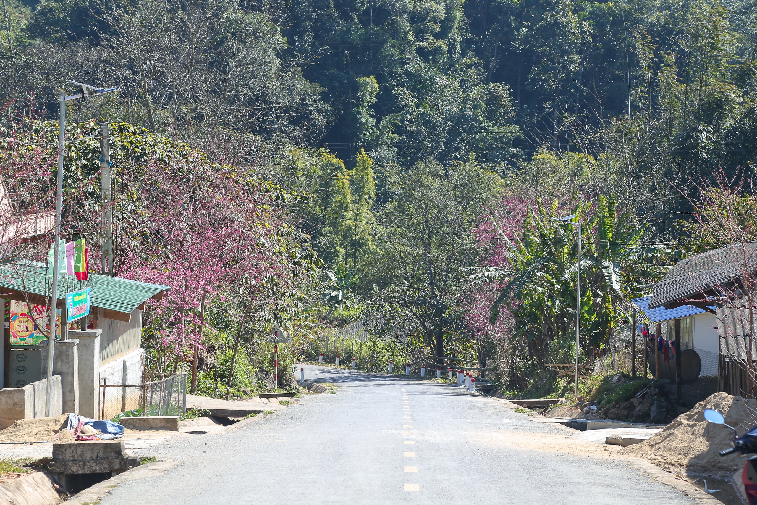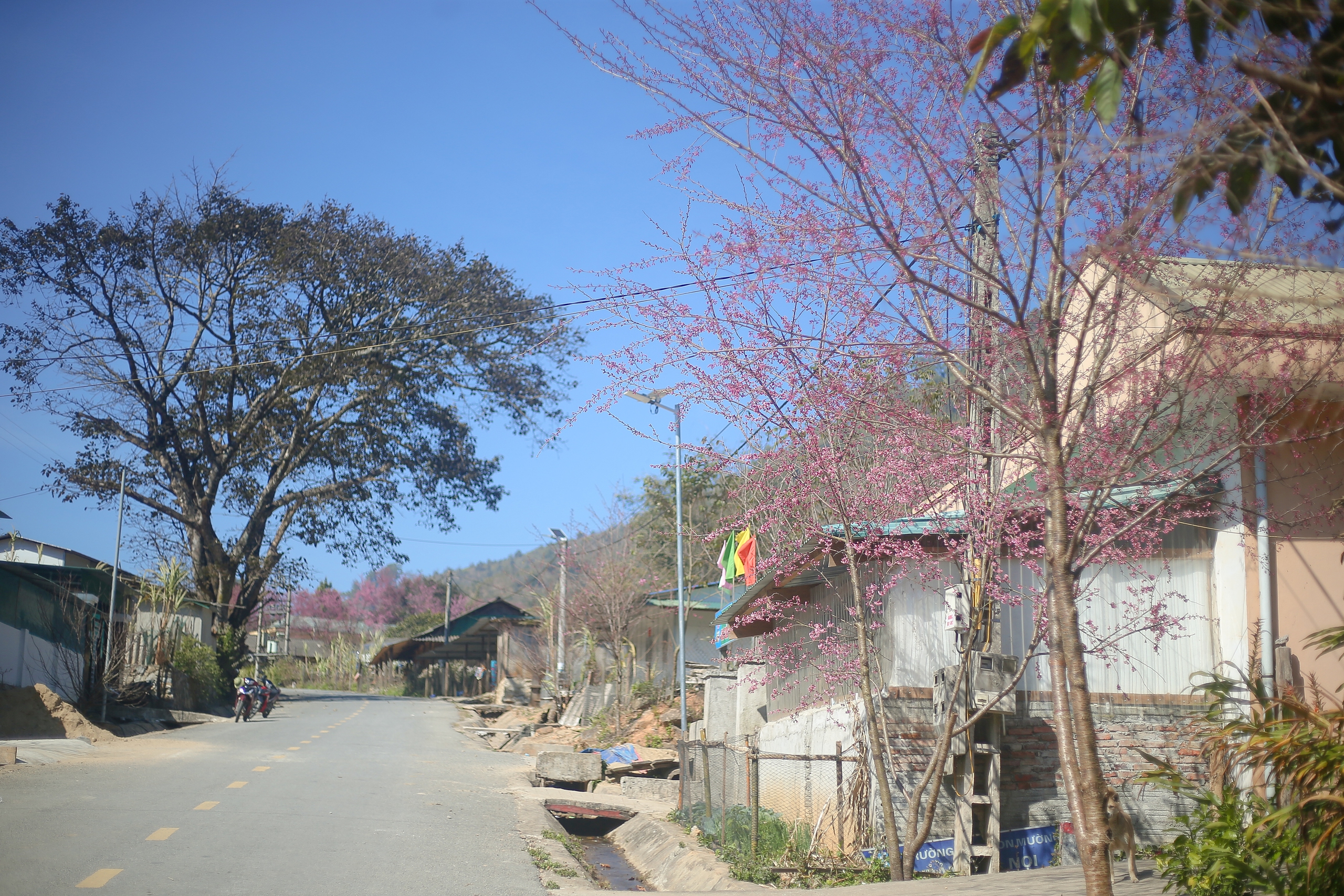 Dọc hai bên đường, cả vạt cây anh đào bung hoa đỏ rực xen lẫn sắc xanh của vùng trời nơi miền biên viễn tạo nên một khung cảnh thanh bình.