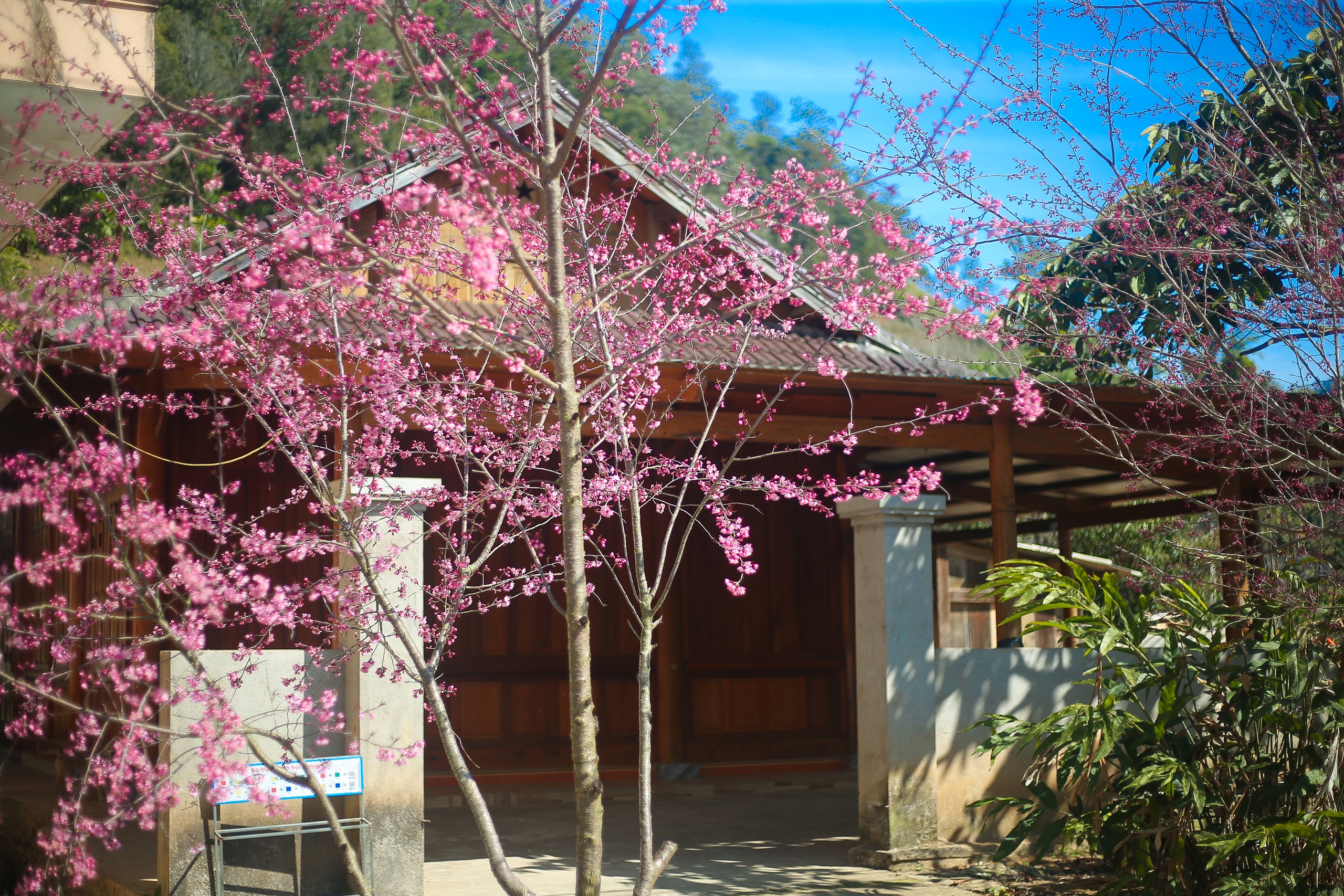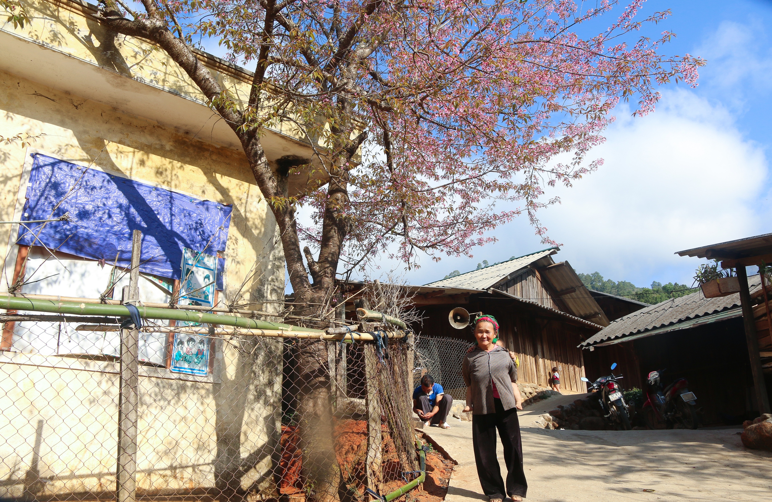 Những cành anh đào bung nở, khoe sắc trong nắng bên những mái nhà sàn được lợp ngói bằng gỗ pơmu của đồng bào Mông tạo nên bức tranh kỳ ảo mê hoặc lòng người.