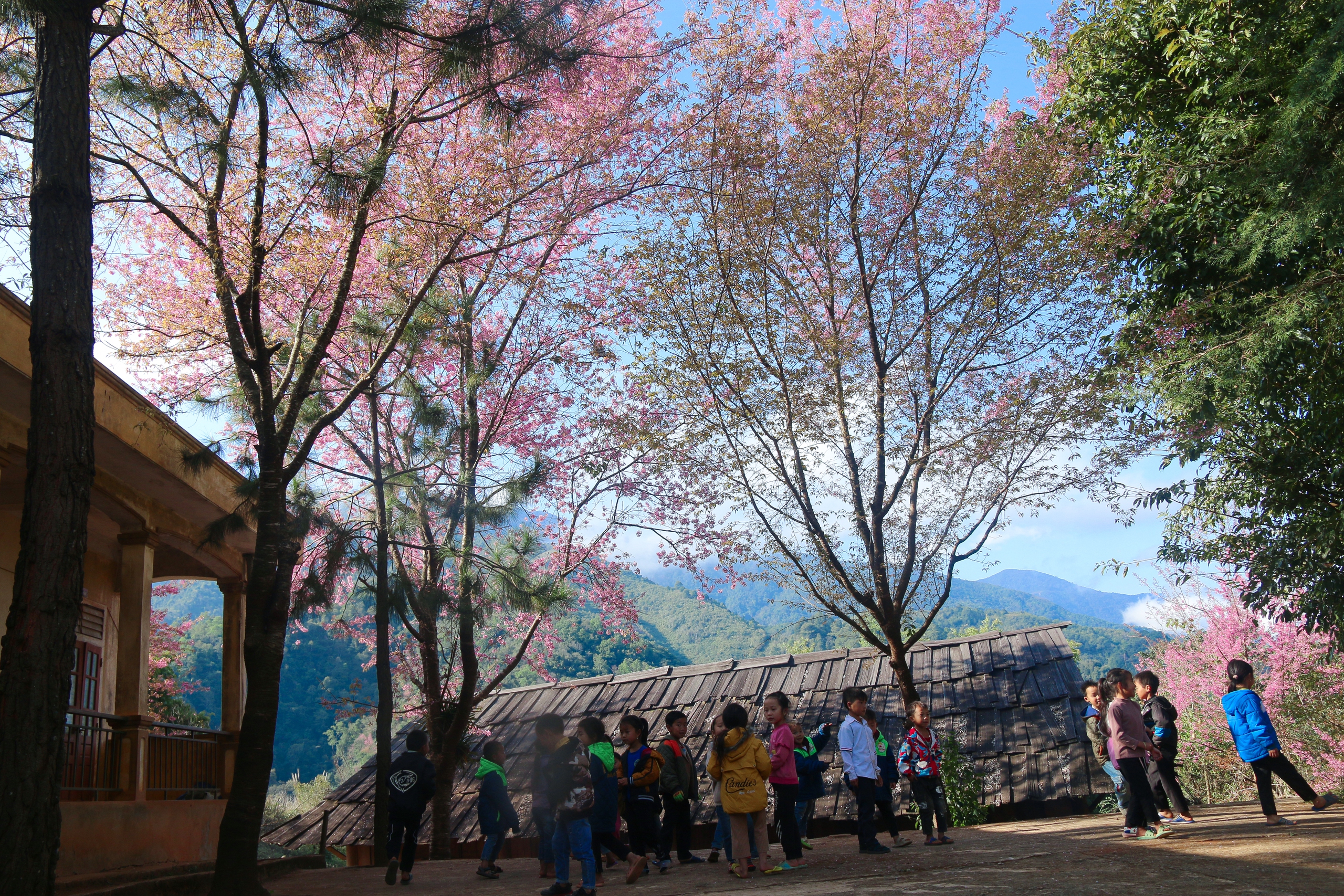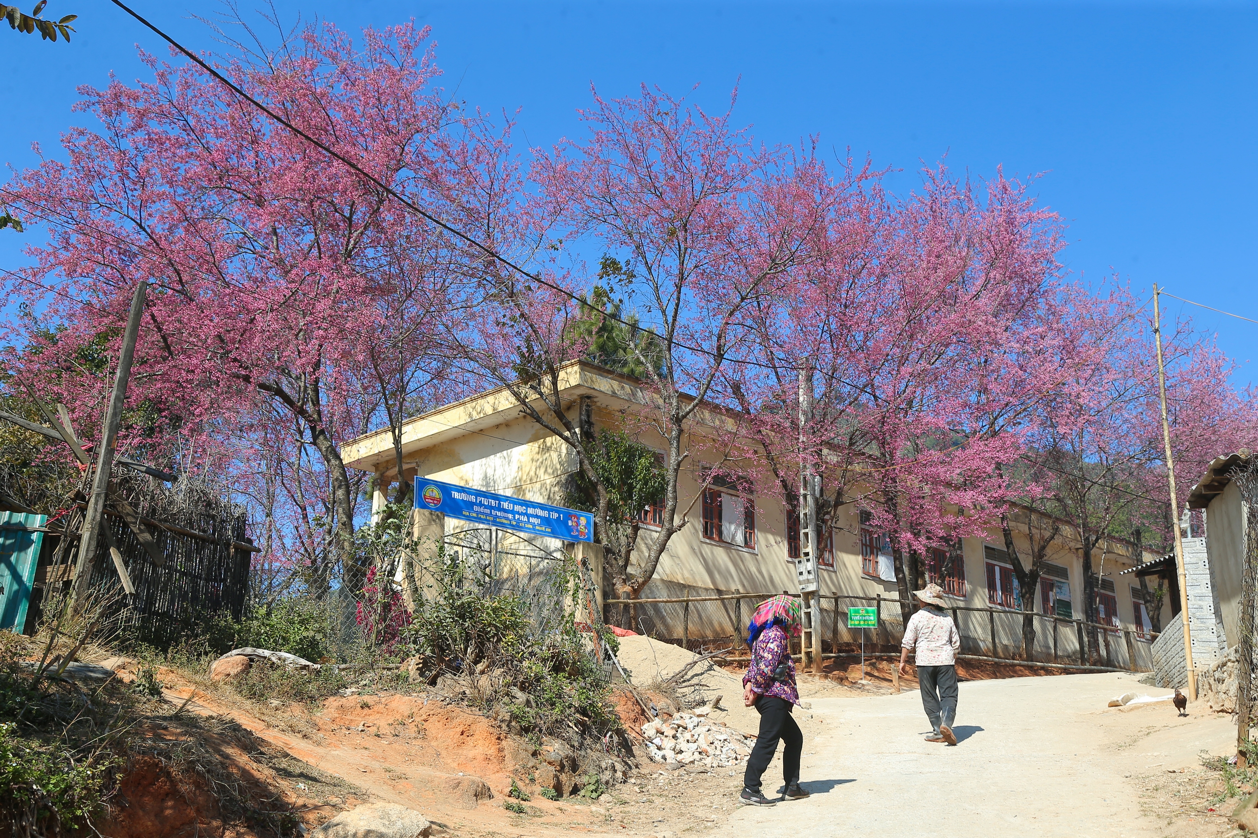 Đặc biệt là xung quanh khuôn viên Trường tiểu học Mường Típ, điểm bản Phà Nọi những cây anh đào khủng với những chùm hoa chi chít bung tỏa rực rỡ như tô điểm cho ngôi trường nhỏ.