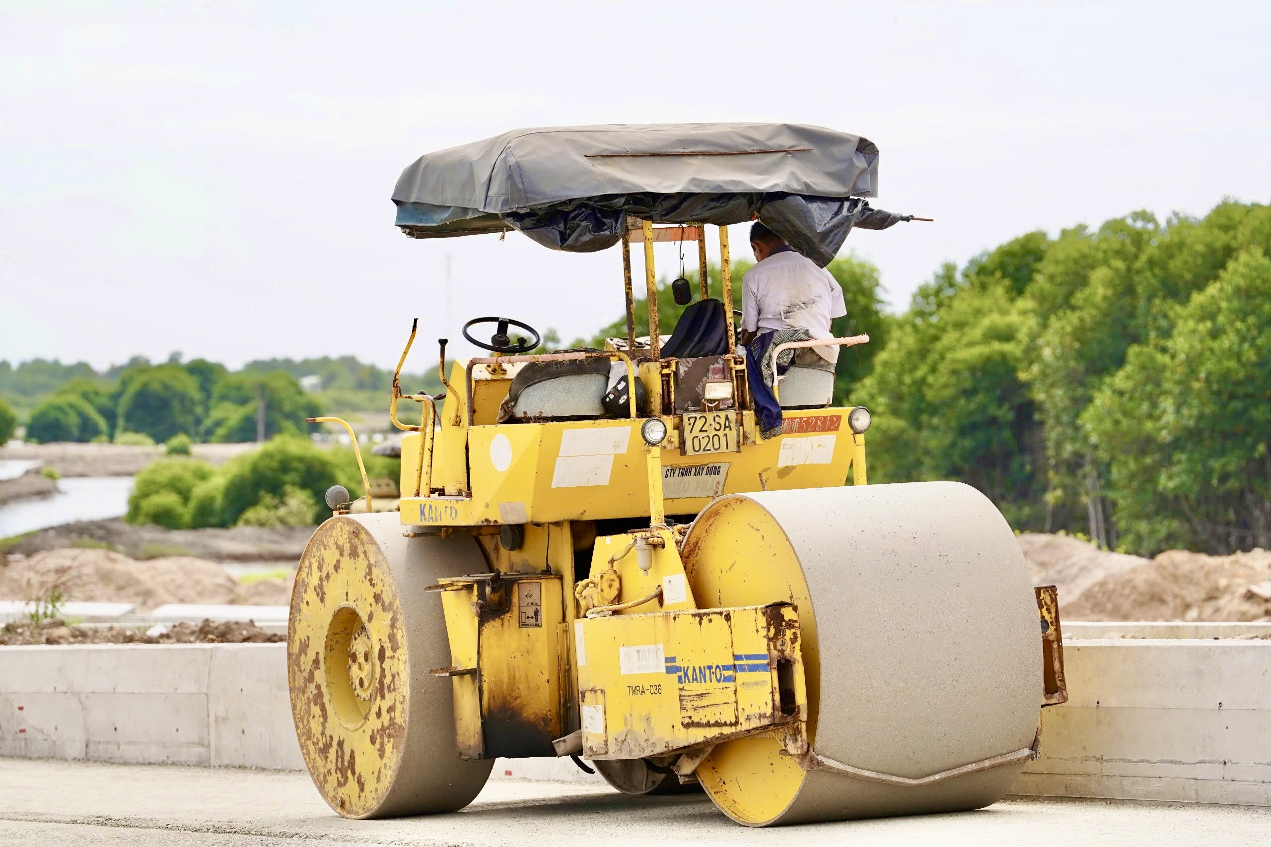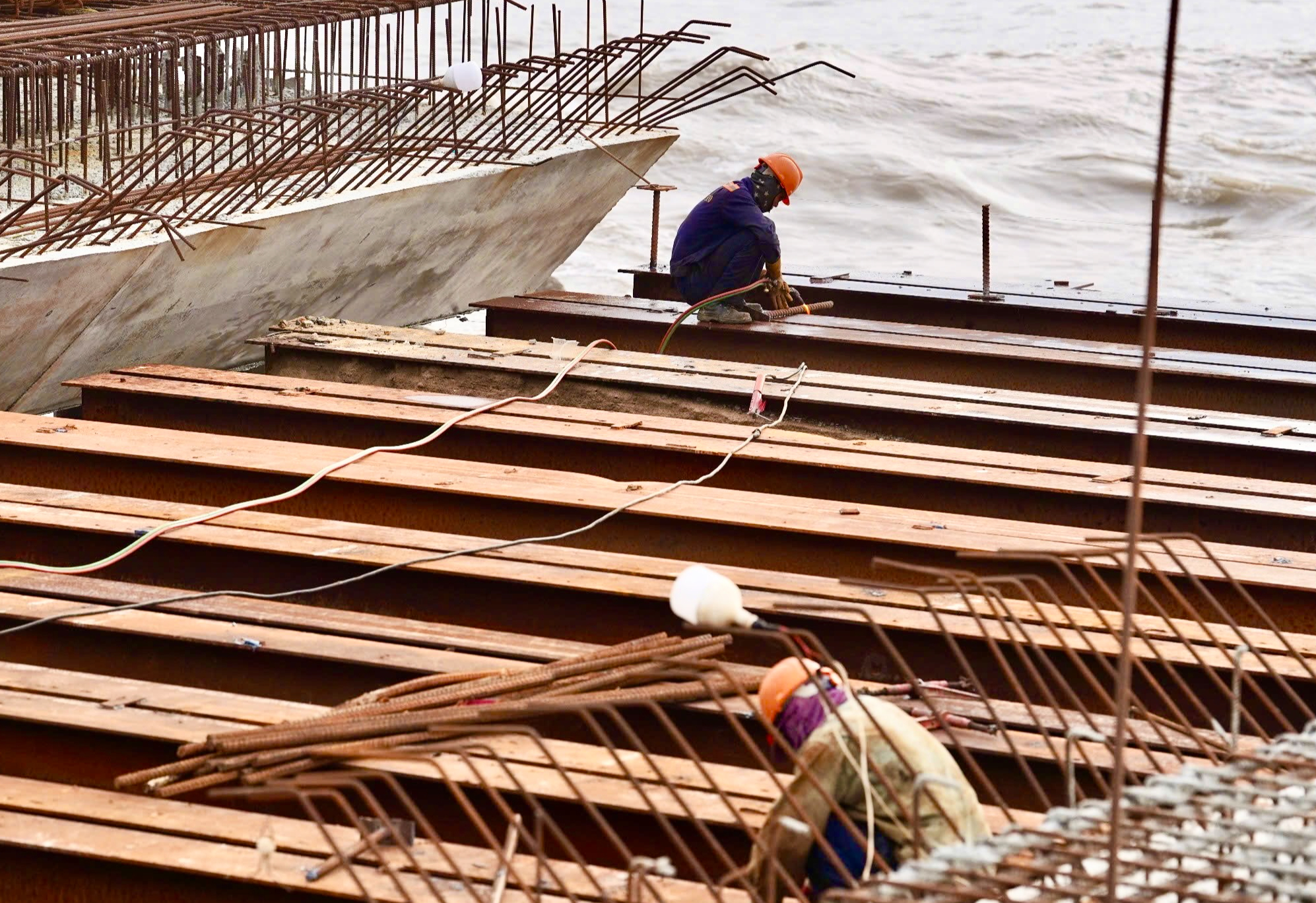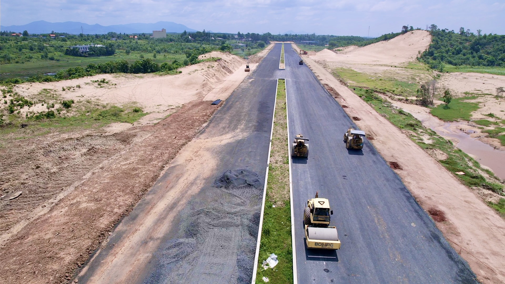 Trên nền đất, cát bỏng rát, hàng trăm kỹ sư, công nhân tỏa ra khắp nơi, người khoan cọc, người đổ bê tông, người thảm nhựa, người làm phần đường, người lại thi công cầu… Nhiều mũi thi công được tổ chức song song, ở những đoạn nền đất yếu, từng tổ máy liên tục khoan cọc, gia cố móng. Ở những đoạn đã định hình nền đường, công nhân tất bật thảm nhựa, lắp lan can, dải phân cách, hệ thống chiếu sáng…