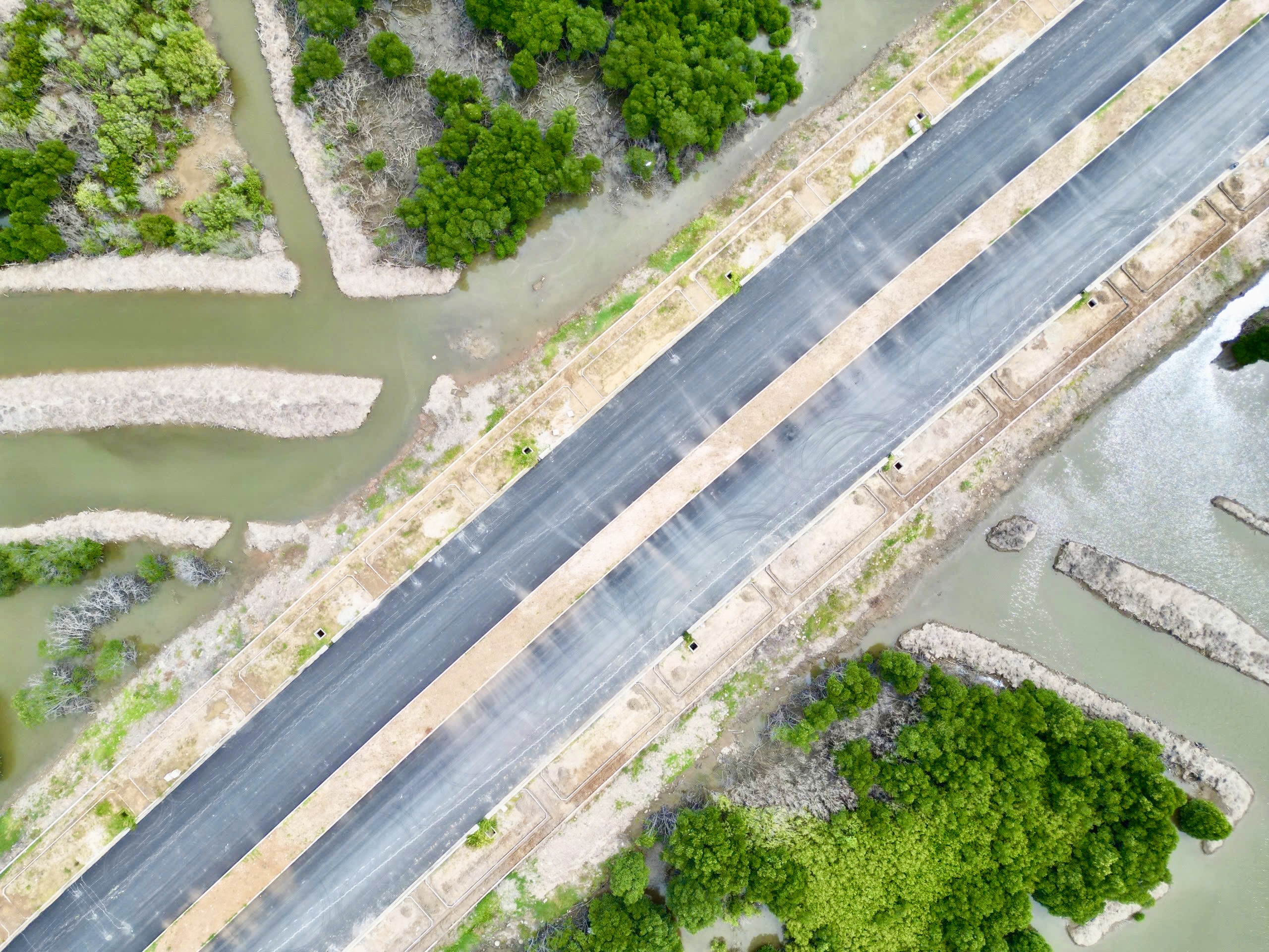 Ở khu vực này, khi bắt đầu khởi động xe máy thiết bị di chuyển khó khăn, có những ngày mưa lớn, bùn trồi lên mặt đường, máy móc phải ngừng hoạt động chờ ổn định nền đất. Dù vậy các nhà thầu vẫn nỗ lực thi công và đến nay đường đã rõ hình hài, một số đoạn được thảm nhựa. Nay mặt đường phẳng lỳ, dải nhựa đen trải dài giữa vùng đầm nước mênh mông, tạo nên tương phản rõ nét giữa thiên nhiên hoang sơ và công trình đường lớn đang thành hình.