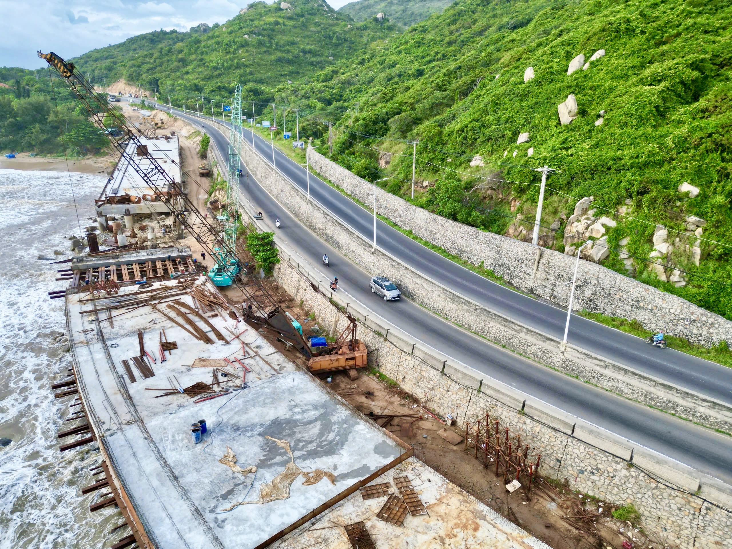 Còn đoạn qua Đèo Nước Ngọt được xem là vị trí thi công khó khăn nhất của toàn tuyến. Một bên là núi đá dựng đứng, một bên là biển xanh sâu thẳm. Địa hình hiểm trở khiến phương án mở rộng mặt đường cũng gặp không ít khó khăn. Nhà thầu thi công cầu cạn men theo sườn núi, các tổ thi công đang khoan cọc nhồi giữa vách đá cheo leo. Có vị trí, công nhân phải đu mình trên giàn giáo, gió biển thổi mạnh khiến từng thao tác đều phải tính toán kỹ lưỡng.