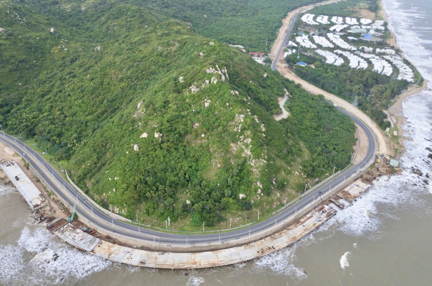 Nhiều trụ cầu đã hoàn thành, dầm cầu được lắp đặt từng nhịp một cách cẩn trọng. Phía dưới, sóng biển đập vào ghềnh đá tung bọt trắng xóa. Còn ở đầu tuyến Đèo Nước Ngọt, mặt bằng mở rộng đã cơ bản hoàn tất. Nhà thầu đang lu nền, rải cấp phối đá dăm và thảm nhựa lớp đầu tiên, chuẩn bị kết nối đồng bộ với phần cầu cạn phía trên.