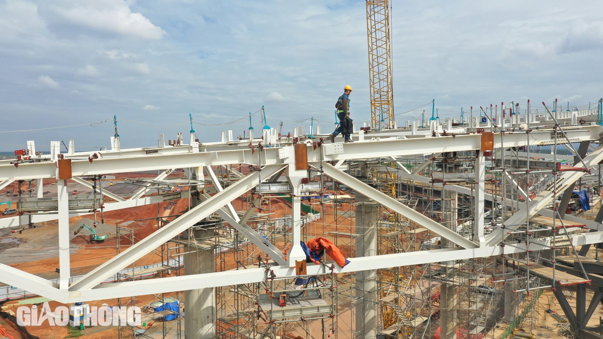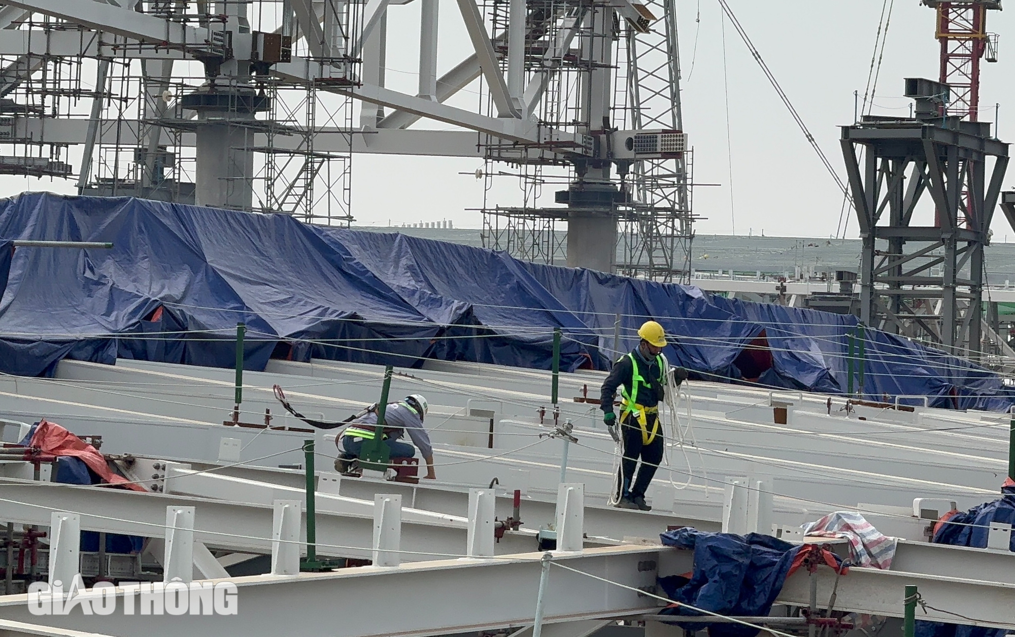 Cùng với lợp mái, hiện nay nhà ga vẫn tiếp tục thi công phần kết cấu thép mái, móng cầu ống lồng, thang bộ hành lang, thang máy... (Trong ảnh là công nhân thi công phần kết cấu thép mái nhà ga trung tâm).