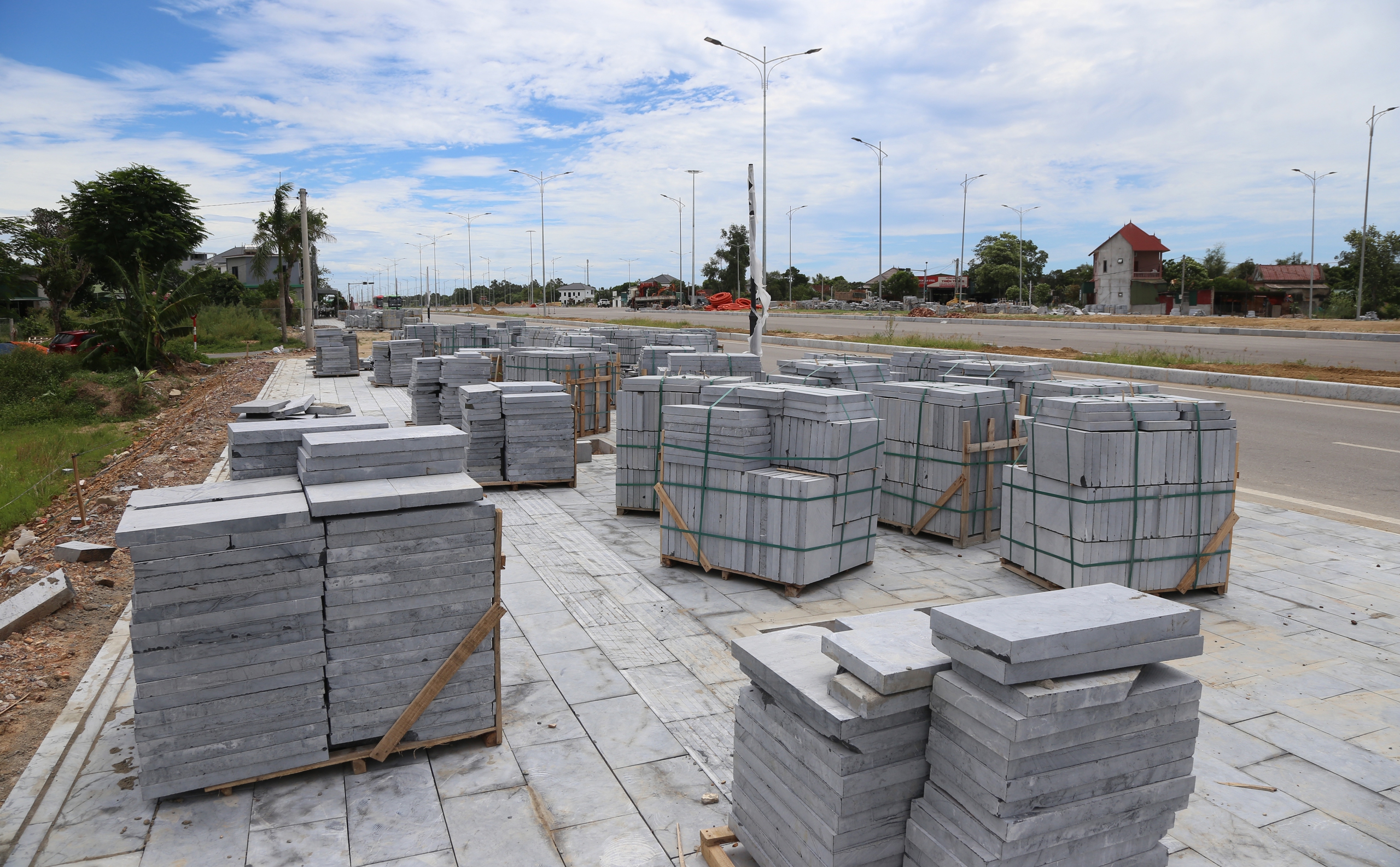 “Sở đã và đang chỉ đạo các nhà thầu huy động toàn bộ nhân lực, máy móc để hoàn thành dự án vào cuối tháng 7/2024”, ông Hoàng cho biết thêm. (Trong hình là các nhà thầu tập kết gạch lát vỉa hè về tại công trường để khẩn trương thi công)