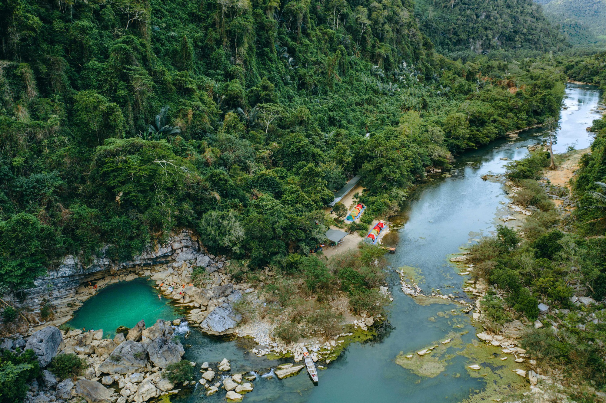 Khung cảnh thơ mộng tại bãi trại Hang Tiên. Du khách sẽ được cắm trại tại đây khi tham gia các tour Thám hiểm Hang Tiên (HT3), Thám hiểm Tú Làn (TL4).