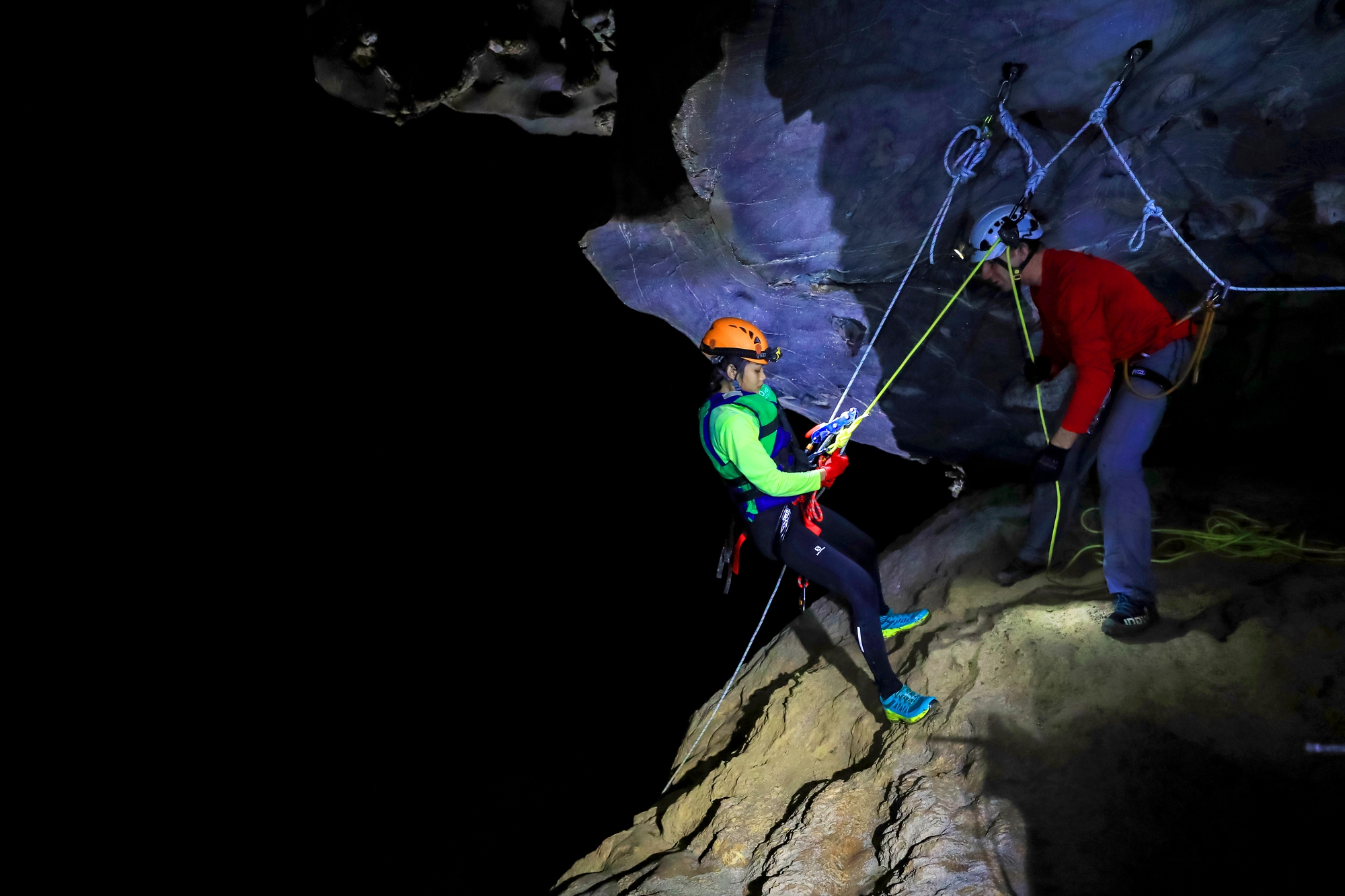 Một trải nghiệm thú vị khác khi tham gia tour của Oxalis là cầu thang cao 15m bên trong Hang Hung Ton. Du khách được trang dây đai an toàn để chiêm ngưỡng những khối thạch nhũ to.