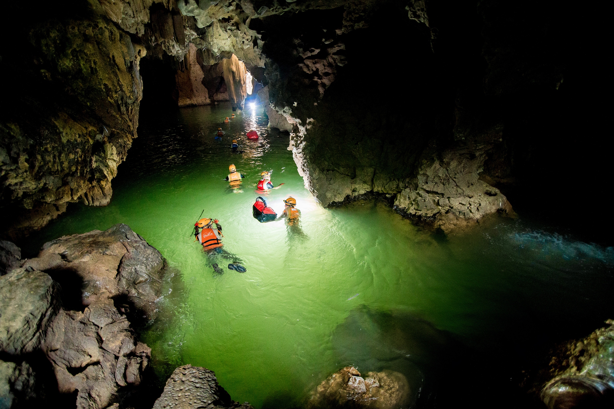 Bơi trong sông ngầm hang động là một trong những trải nghiệm rất độc đáo của các tour ở Tú Làn. Du khách sẽ được hòa mình vào dòng suối mát lạnh và cùng ngắm nhìn khung cảnh thiên nhiên Tú Làn thơ mộng.
