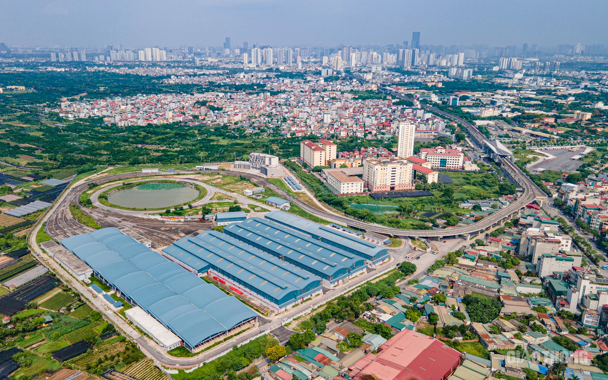 Tuyến Metro Nhổn - ga Hà Nội dài 12,5km với 8,5km đi trên cao và 4km đi ngầm, qua 6 quận gồm: Bắc Từ Liêm, Nam Từ Liêm, Cầu Giấy, Ba Đình, Đống Đa và Hoàn Kiếm. Dự án khởi công năm 2010 và dự kiến hoàn thành vào năm 2016. Sau nhiều lần lùi tiến độ, mốc hoàn thành mới toàn tuyến là năm 2027. Riêng đoạn trên cao sẽ vận hành thương mại vào tháng 7/2024. Trong ảnh khu depot tại Nhổn với những nhà ống là nơi bảo dưỡng, chứa các toa tầu.