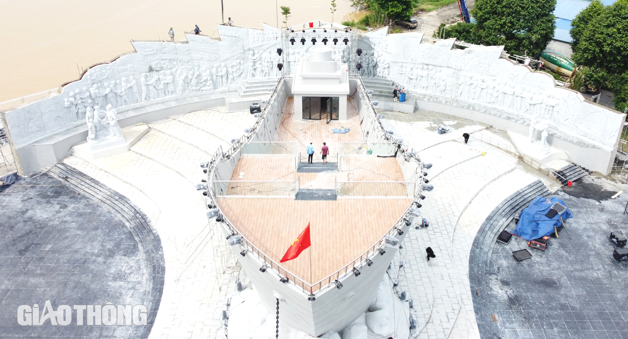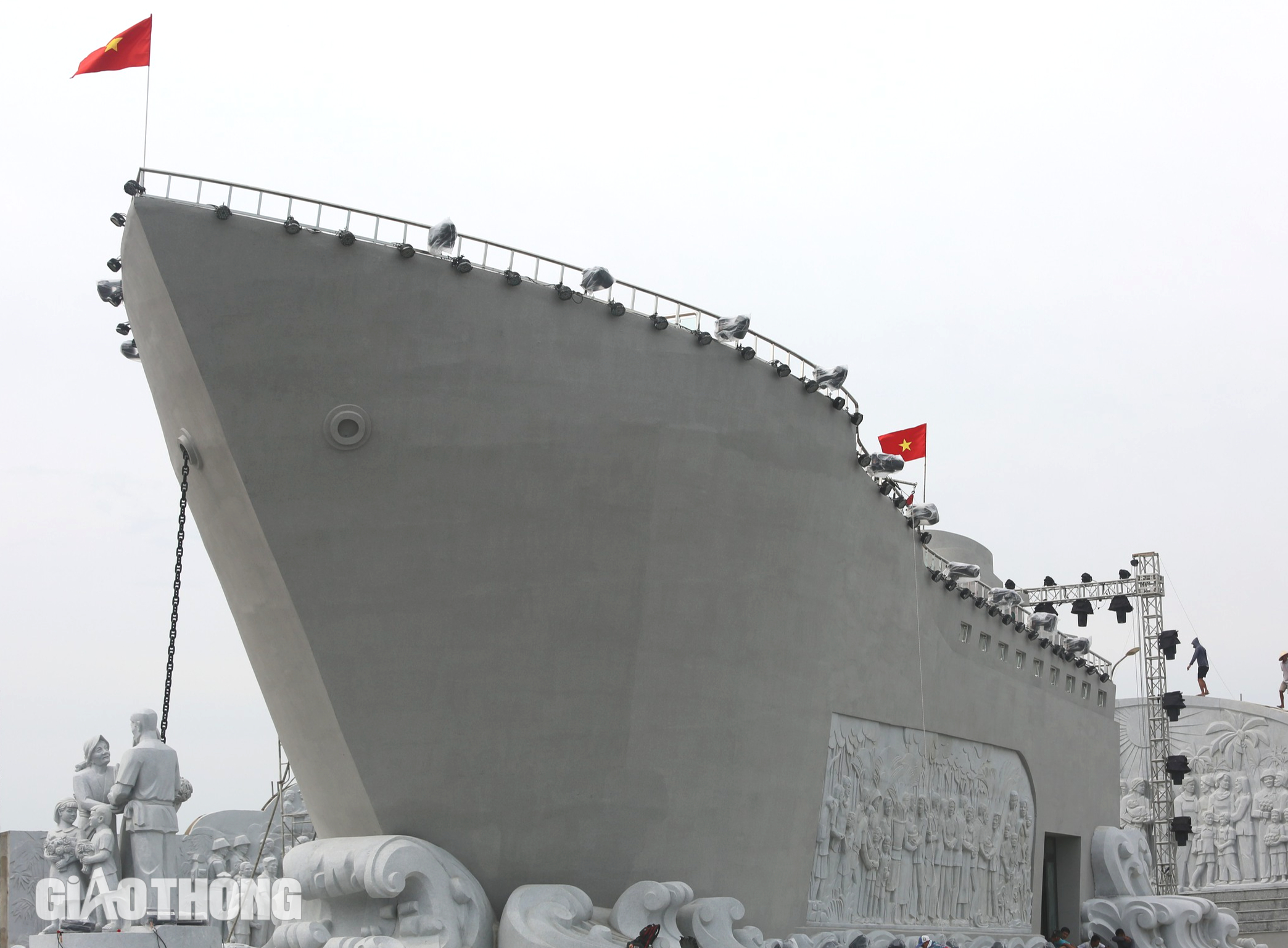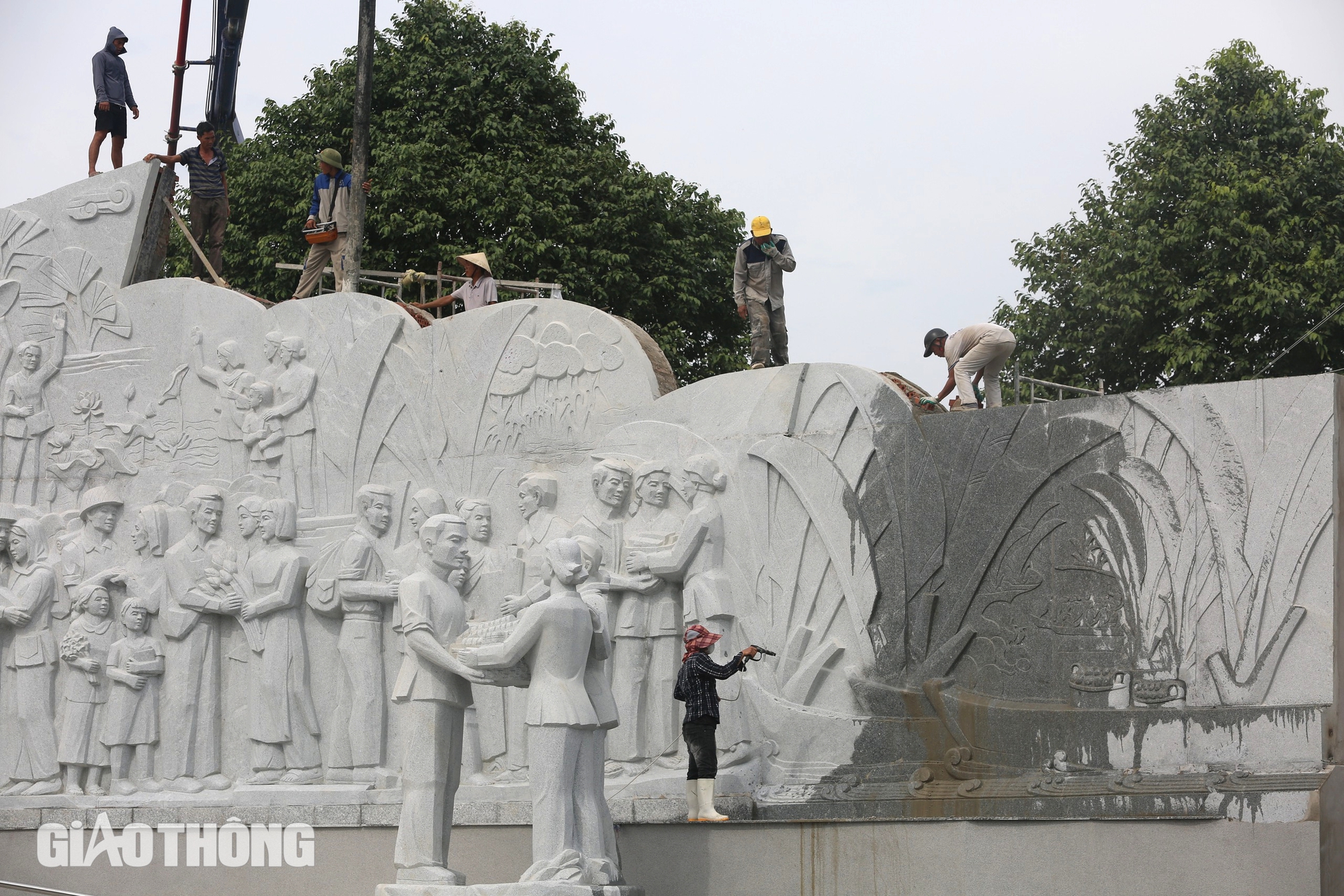 Công nhân đang tiến hành vệ sinh bức phù điêu, hoàn thiện các công đoạn cuối cùng của tượng đài "Con tàu tập kết ra Bắc".