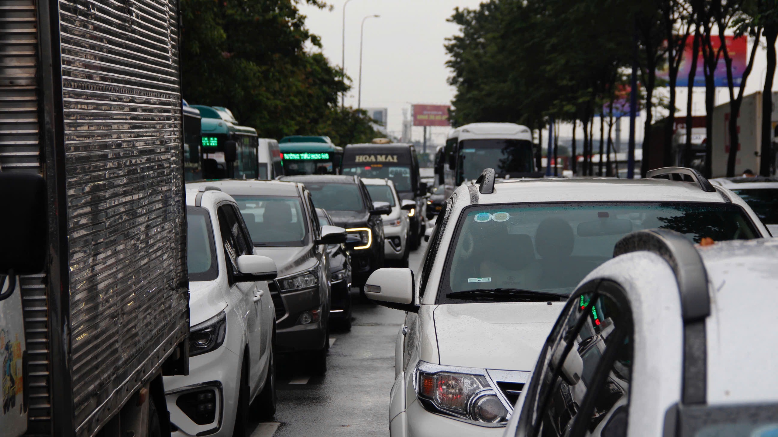 Tại khu vực vòng xoay An Phú - nơi kết nối với cao tốc TP.HCM - Long Thành - Dầu Giây, lượng phương tiện dồn về quá lớn khiến giao thông tê liệt nhiều giờ. Hàng loạt ô tô nối đuôi nhau, xếp hàng san sát, nhích từng chút một trong sự mệt mỏi.