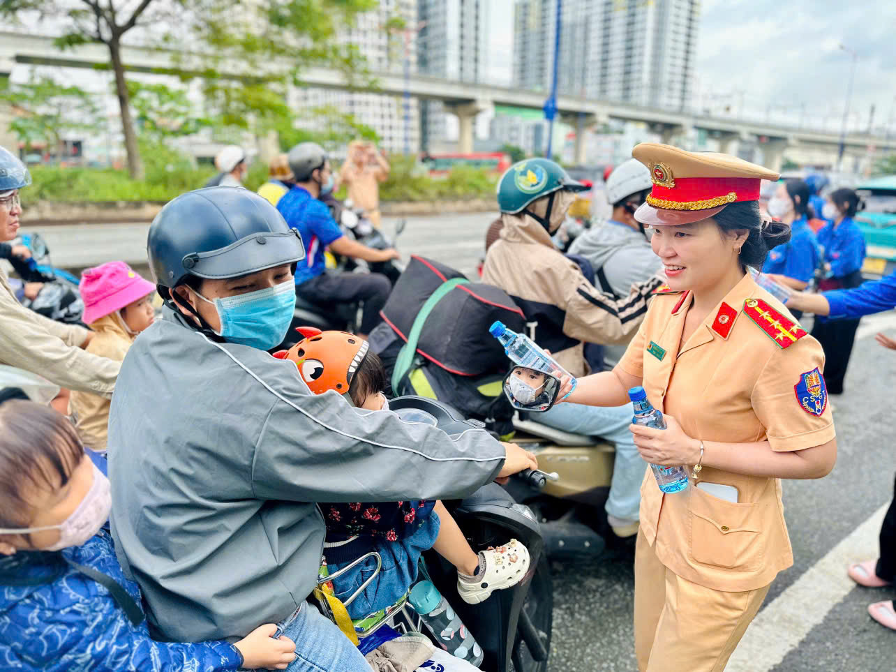 Ngoài việc có mặt tại các điểm nóng để phân luồng, điều tiết giao thông, lực lượng CSGT còn triển khai các tổ công tác tại nhiều khu vực cửa ngõ thành phố, đặc biệt là các tuyến đường đông người dân về quê bằng xe máy, để phát nước suối, khăn lạnh và hỗ trợ sơ bộ y tế cho những trường hợp cần thiết.
