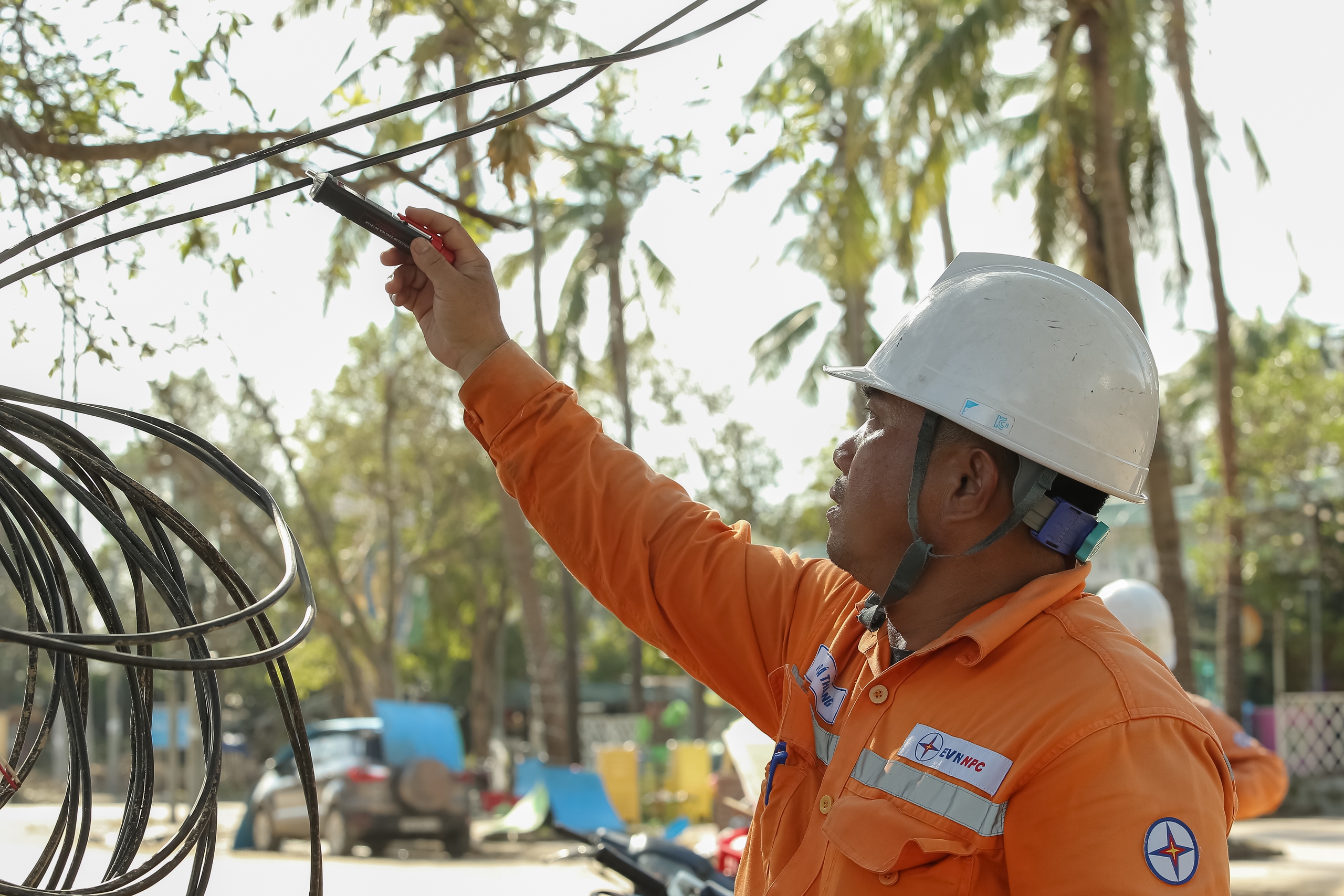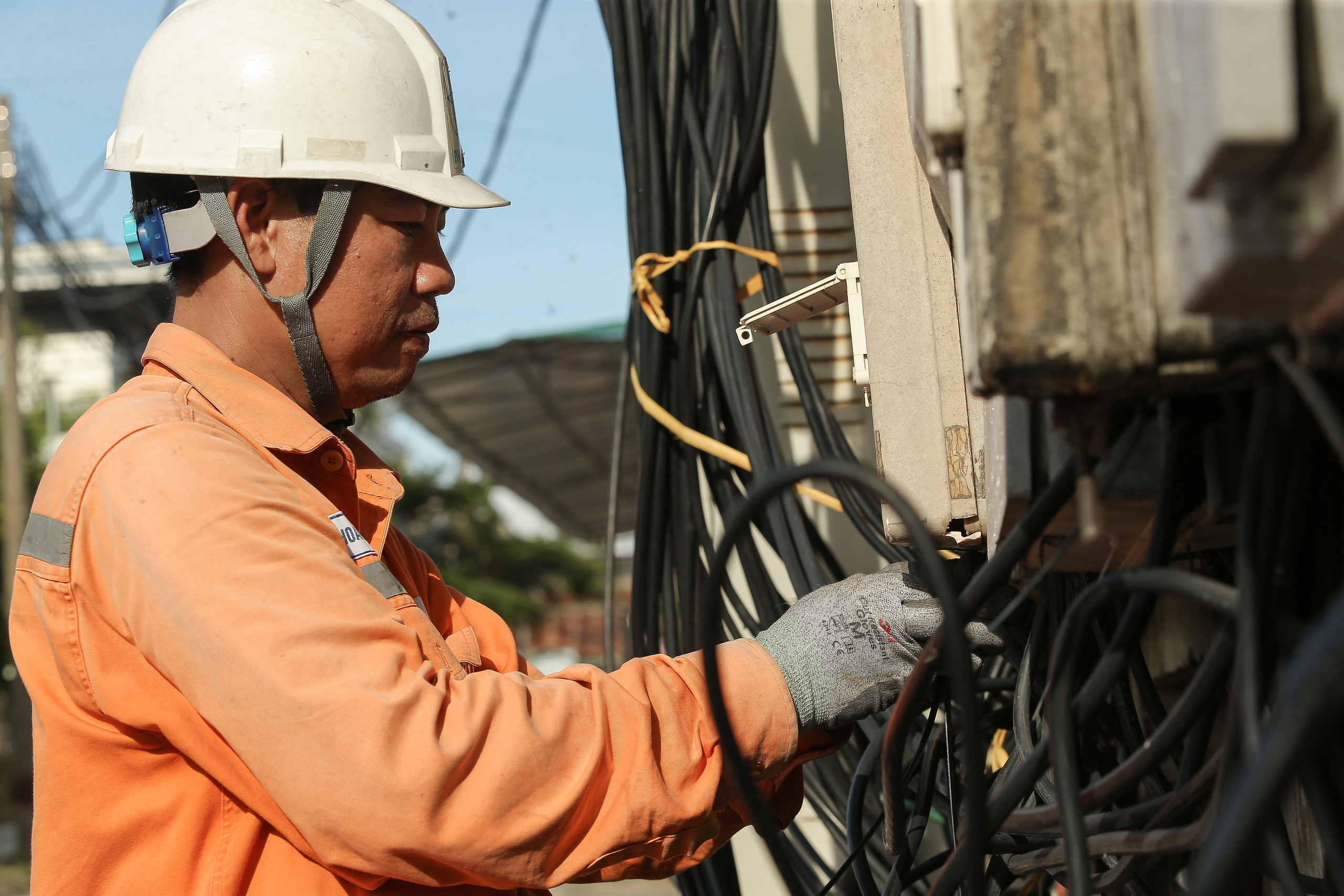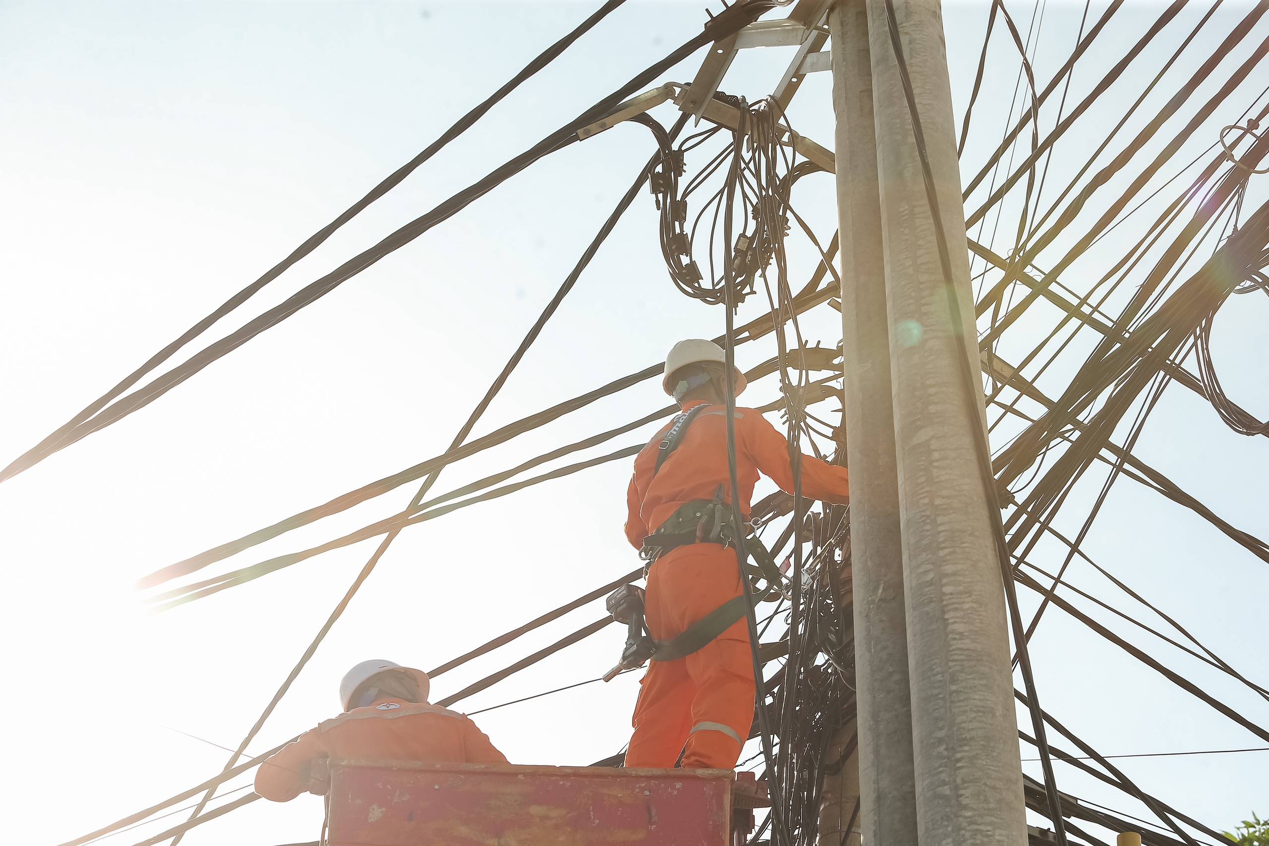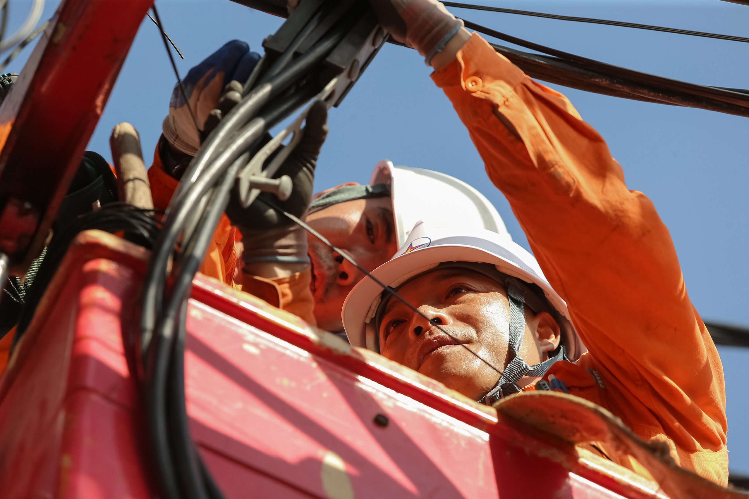 Sau những ngày mưa bão, thời tiết chuyển nắng gay gắt khiến không khí càng trở nên oi bức, ngột ngạt. Các công nhân ngành điện mồ hôi nhễ nhại khi phải phơi mình cả ngày trên cao.