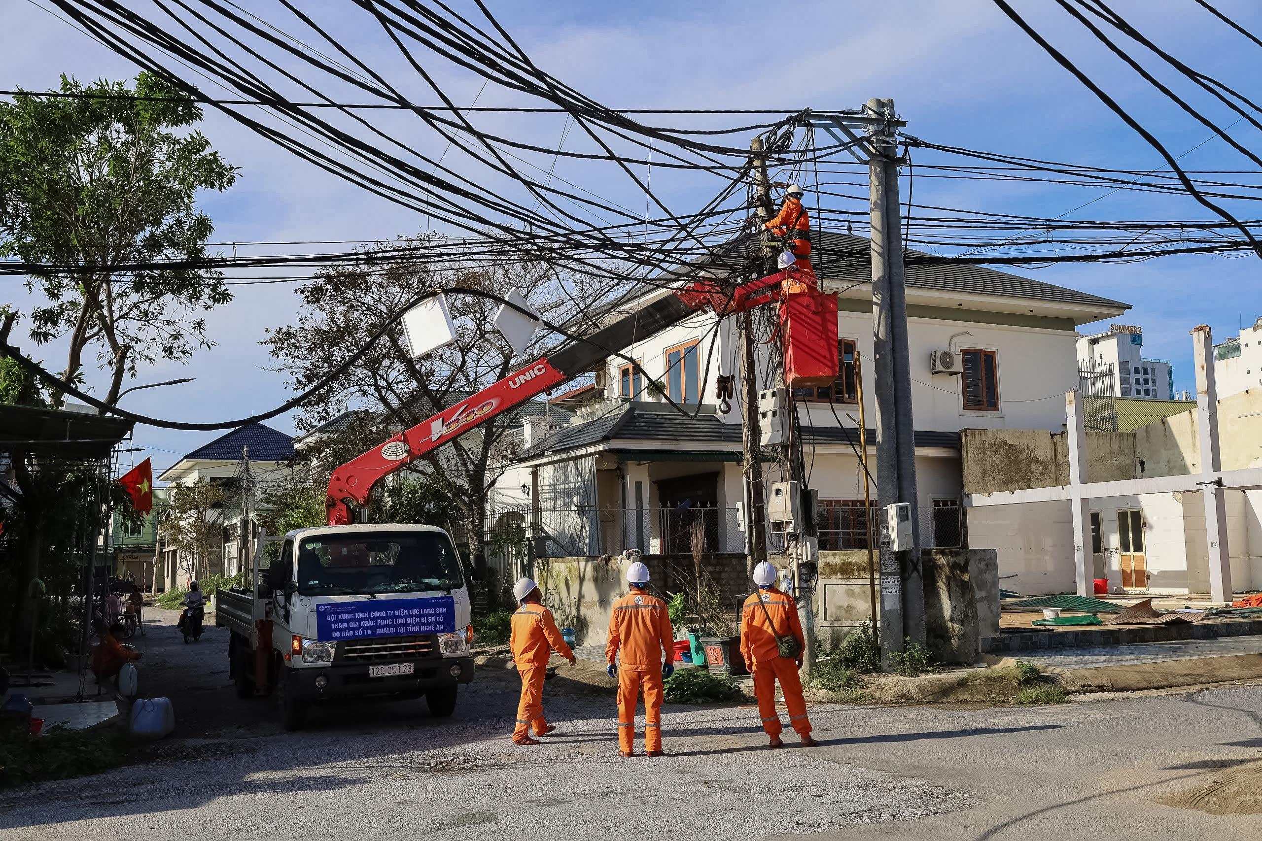 Ông Phạm Văn Nga, Phó giám đốc Công ty Điện lực Nghệ An cho hay, hơn 1.000 cán bộ, nhân viên ngành điện chia thành các tổ để về từng địa phương khắc phục sự cố, trong đó có nhiều đoàn tăng cường từ những tỉnh phía Bắc.