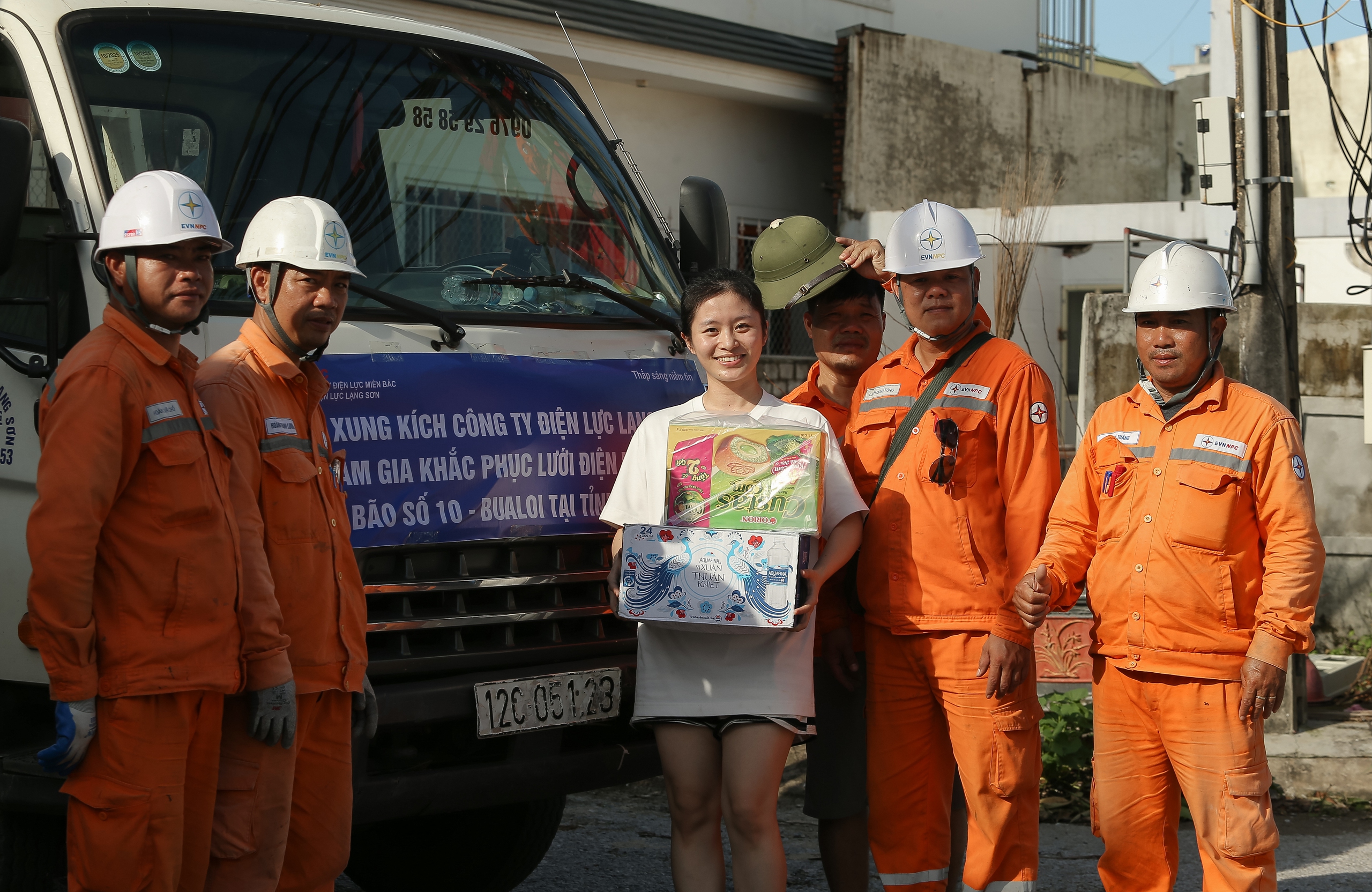 Gửi công nhân điện lực lốc nước lọc và ít nước tăng lực, chị Văn Thị Thuỳ Ngân (khối Thu Thủy, phường Cửa Lò) chia sẻ: Bão số 10 gây thiệt hại nặng trên diện rộng. Mấy hôm nay, các anh điện lực căng mình khắc phục, chúng tôi có chút quà mong tiếp thêm động lực cho các anh.
