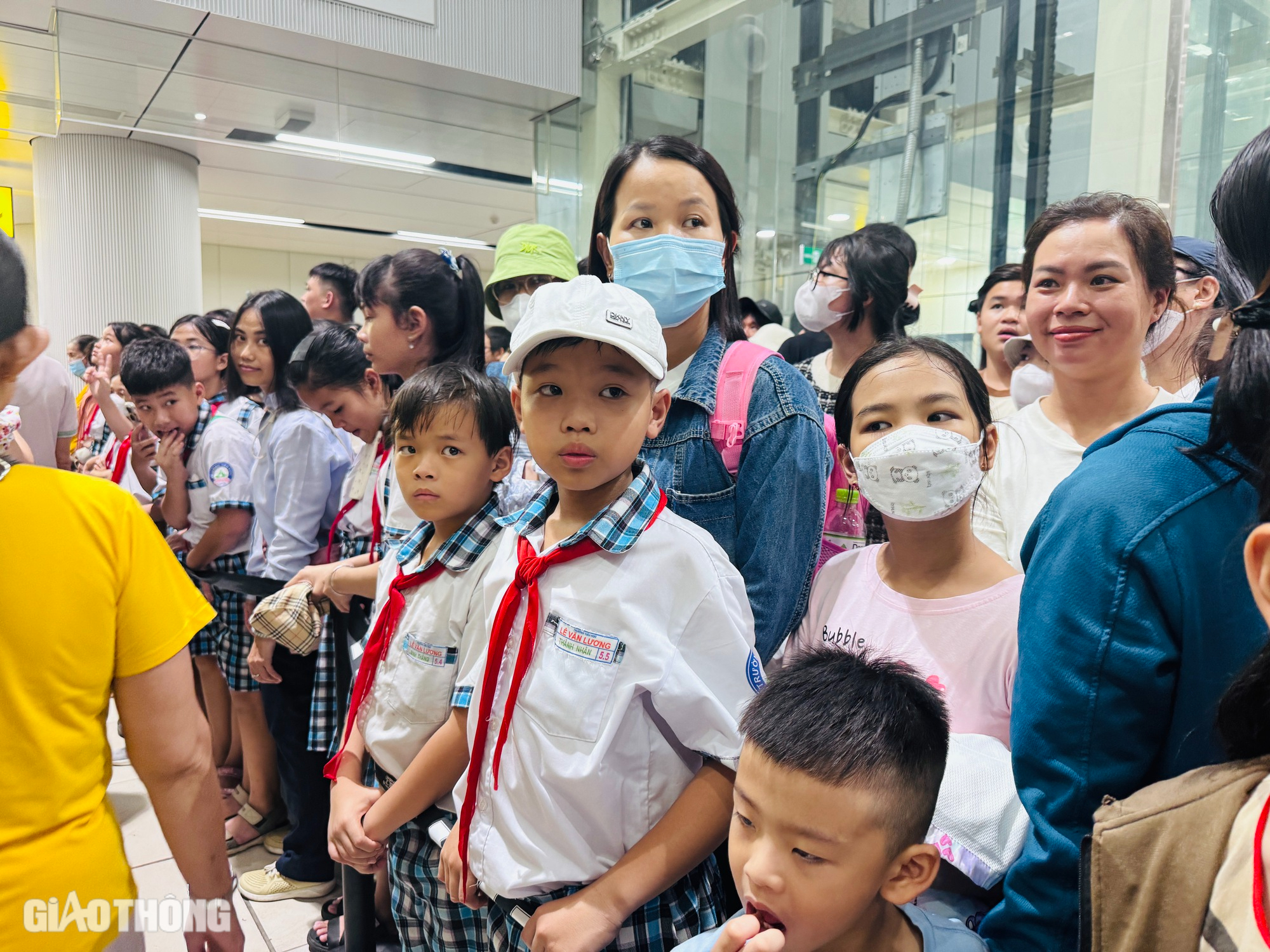 Ngoài các gia đình đưa con nhỏ đi trải nghiệm metro, rất đông học sinh cũng được tổ chức đến ga Bến Thành trong ngày cuối tuần. Chờ đợi lâu nhưng các em nhỏ vẫn rất kiên nhẫn, háo hức.