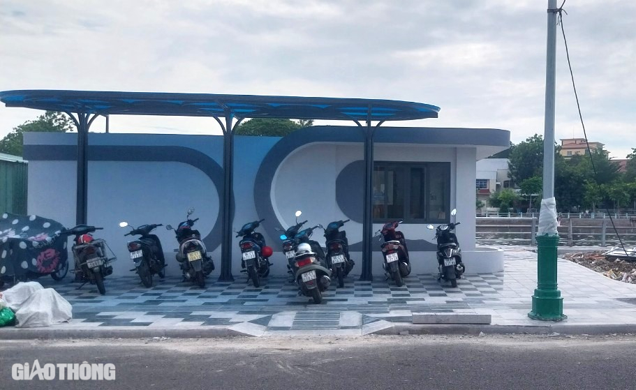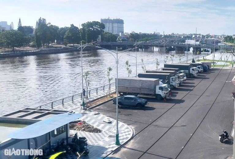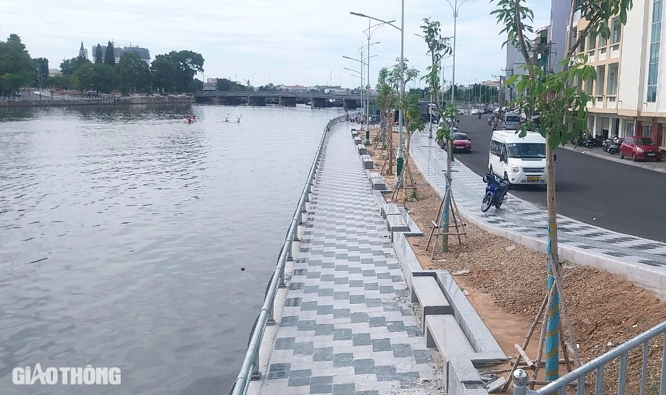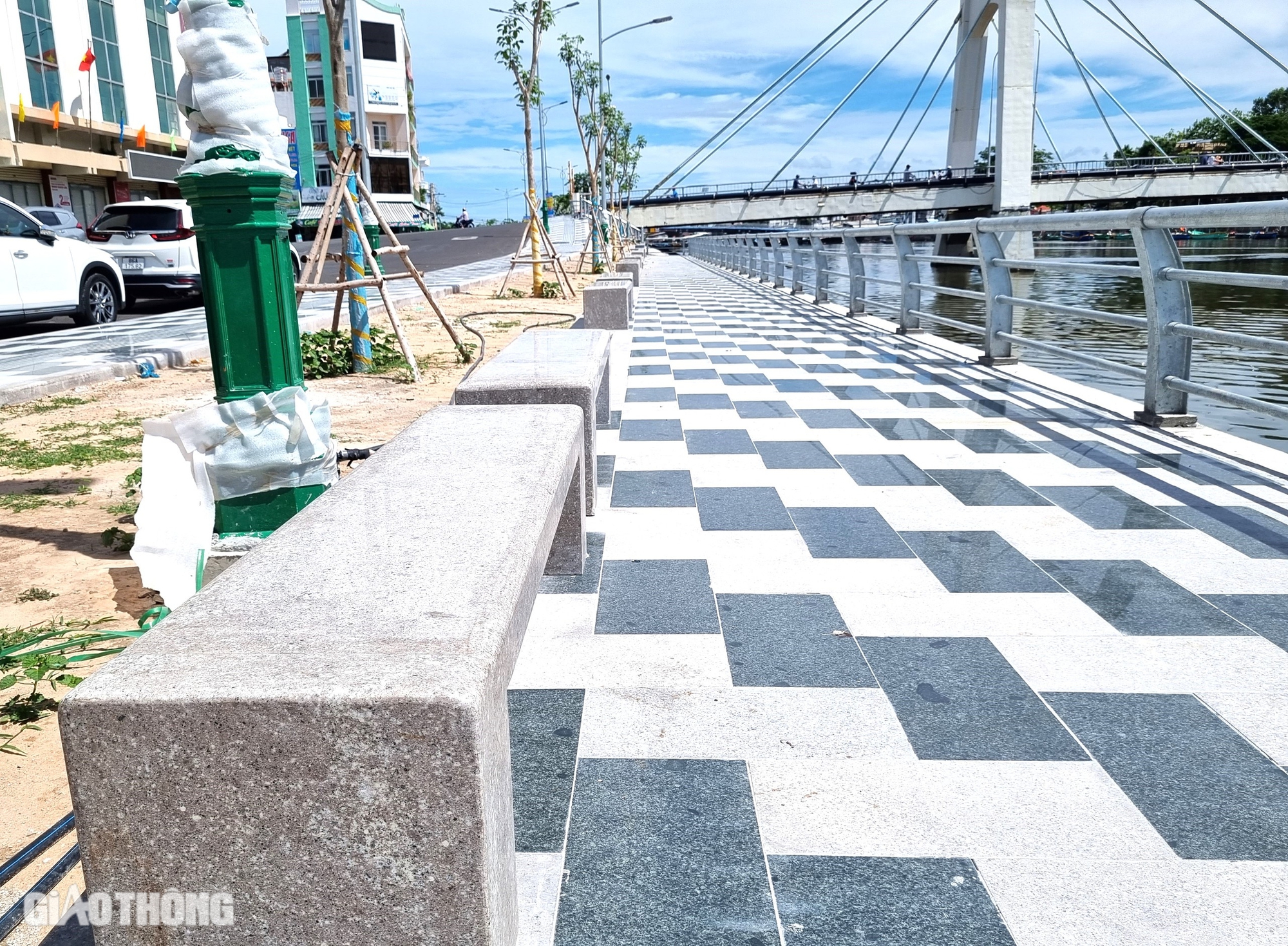 Ghi nhận của PV Báo Giao thông, đến sáng 26/6, các hạng mục cuối cùng như khu nhà vệ sinh công cộng, hạng mục phụ trợ, cây xanh, bãi đỗ xe đã xây dựng xong, nhà thầu đang lắp hệ thống chiếu sáng dọc kè sông.