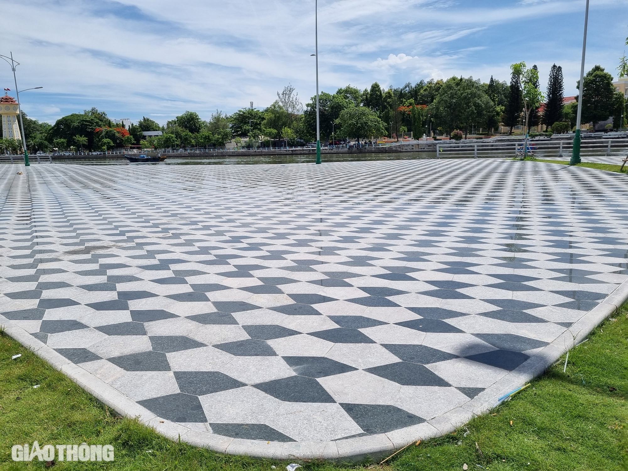Một góc công viên cây xanh ven sông được lát gạch khang trang, sạch đẹp phục vụ người dân và khách du lịch.