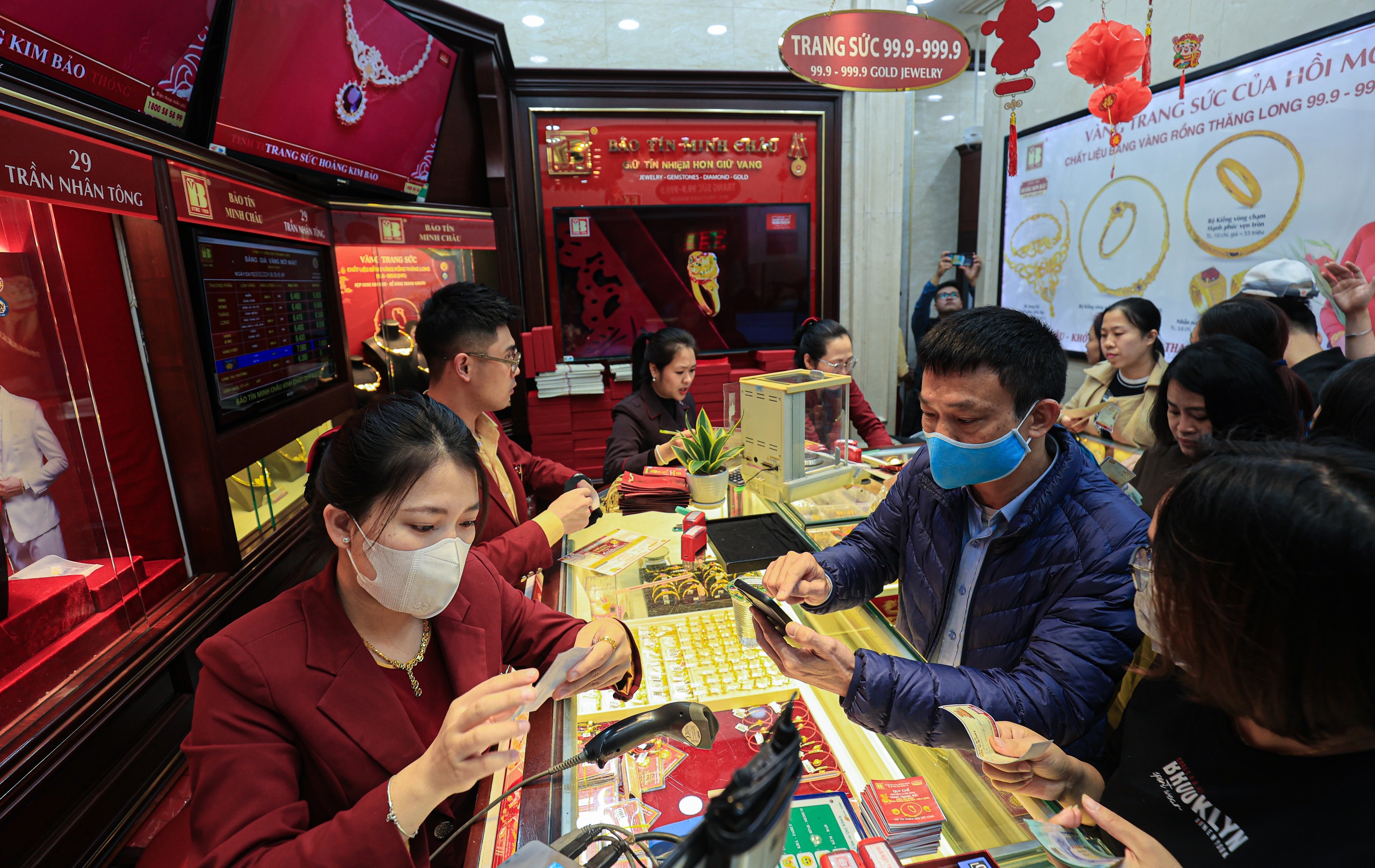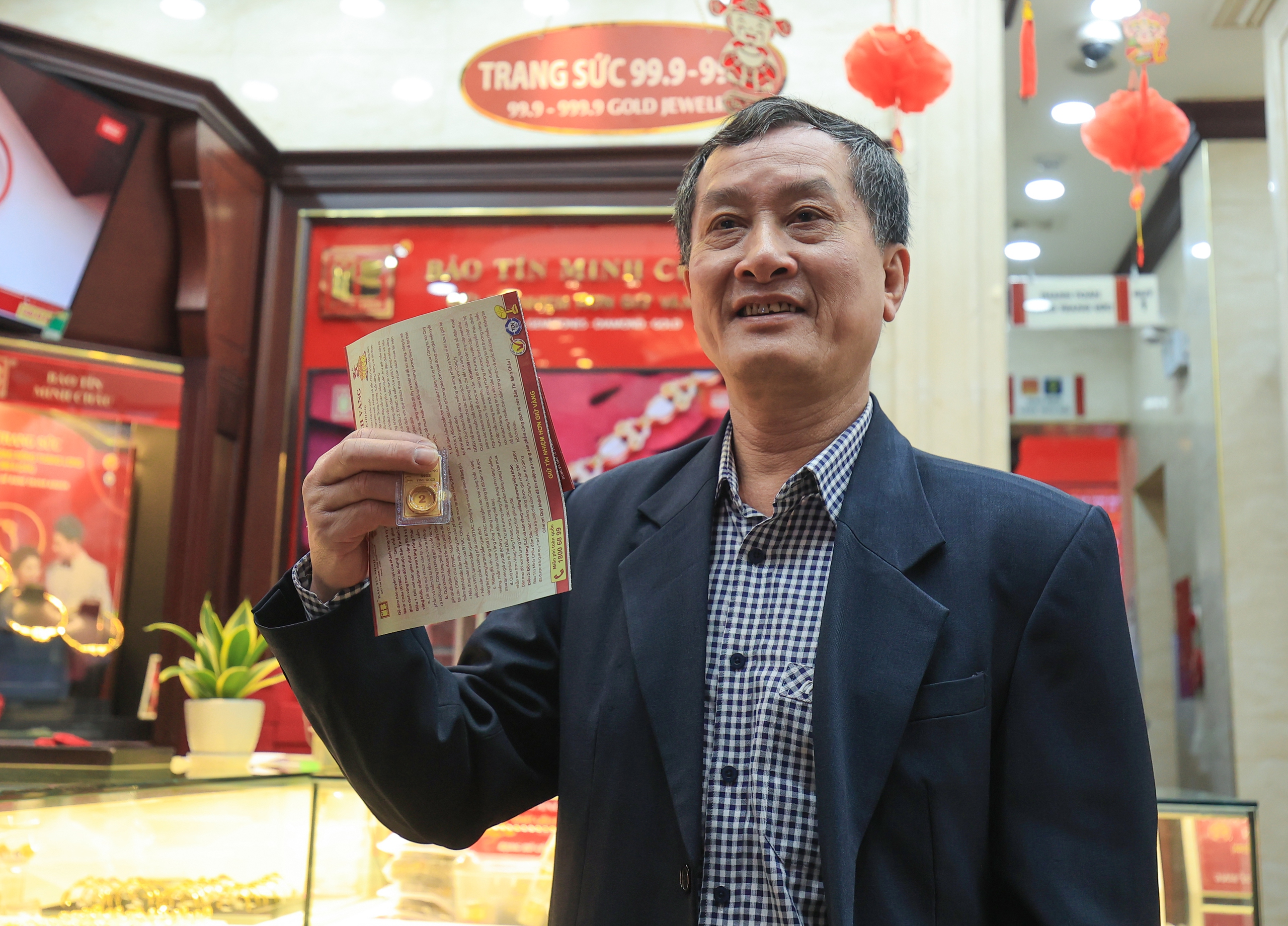 Sau hơn 3 giờ đồng hồ chờ đợi, ông Bình đã cầm trên tay 2 chỉ vàng đầu tiên của cửa hàng trong ngày vía Thần Tài.