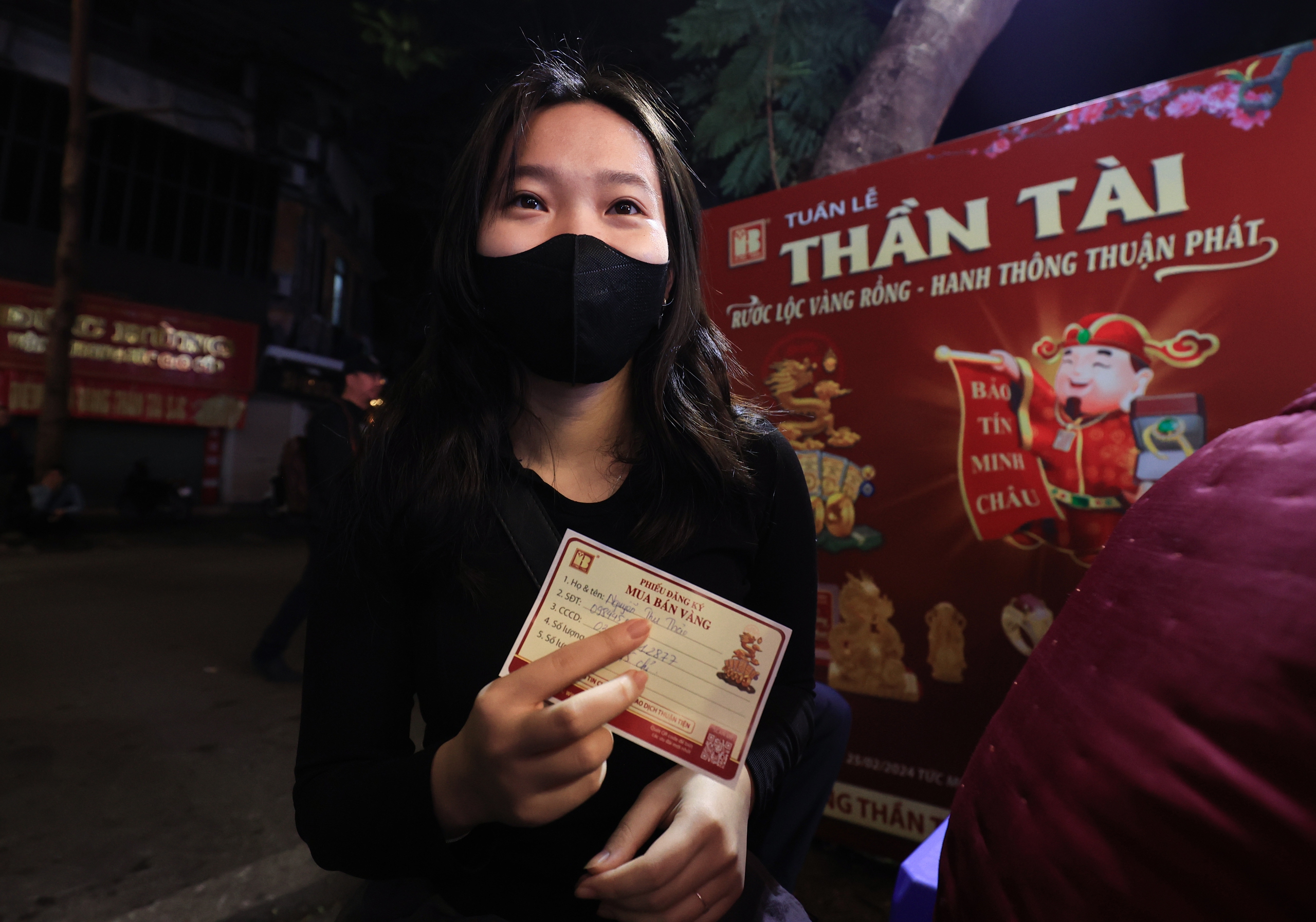 Cầm trên tay lá phiếu thứ tự mua vàng, chị Nguyễn Thu Thảo (quận Hoàng Mai) đã có kinh nghiệm 18 năm đi mua vàng trong ngày này. "Ngay từ khi 8 tuổi, tôi đã được bố mẹ dẫn đi mua vàng và điều này vẫn được duy trì đến bây giờ. Ngày vía Thần Tài năm nay trùng với ngày đi làm đầu tuần nên tôi tranh thủ đi thật sớm với hy vọng làm ăn phát lộc trong năm mới", chị Thảo chia sẻ.