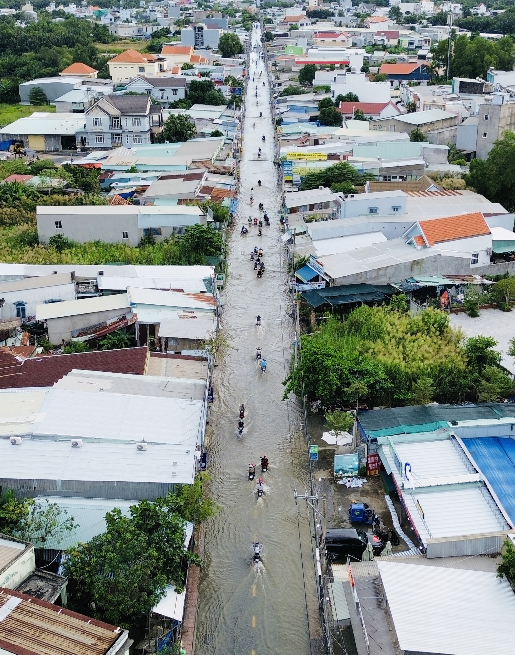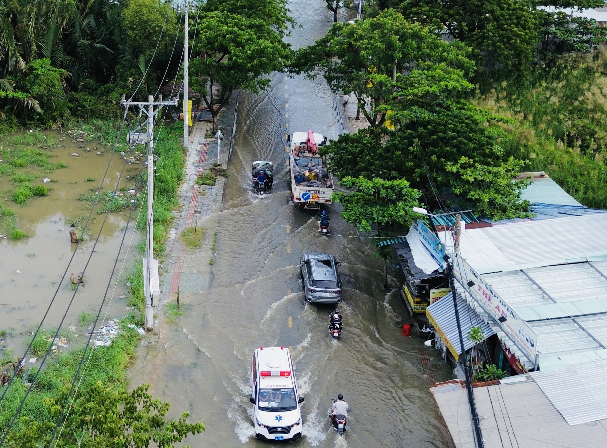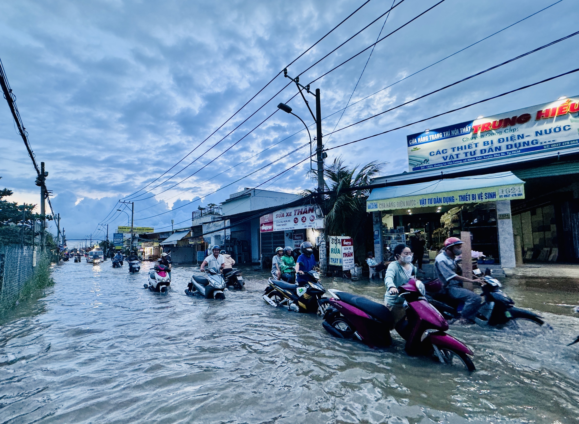 Tại đường Lê Văn Lương (xã Nhơn Đức, huyện Nhà Bè, TP.HCM), nguyên tuyến đường dài lênh láng triều cường. Đoạn từ giao lộ Lê Văn Lương - Nguyên Bình đến cầu Long Kiểng ngập sâu nhất, có nơi lên đến yên xe máy.