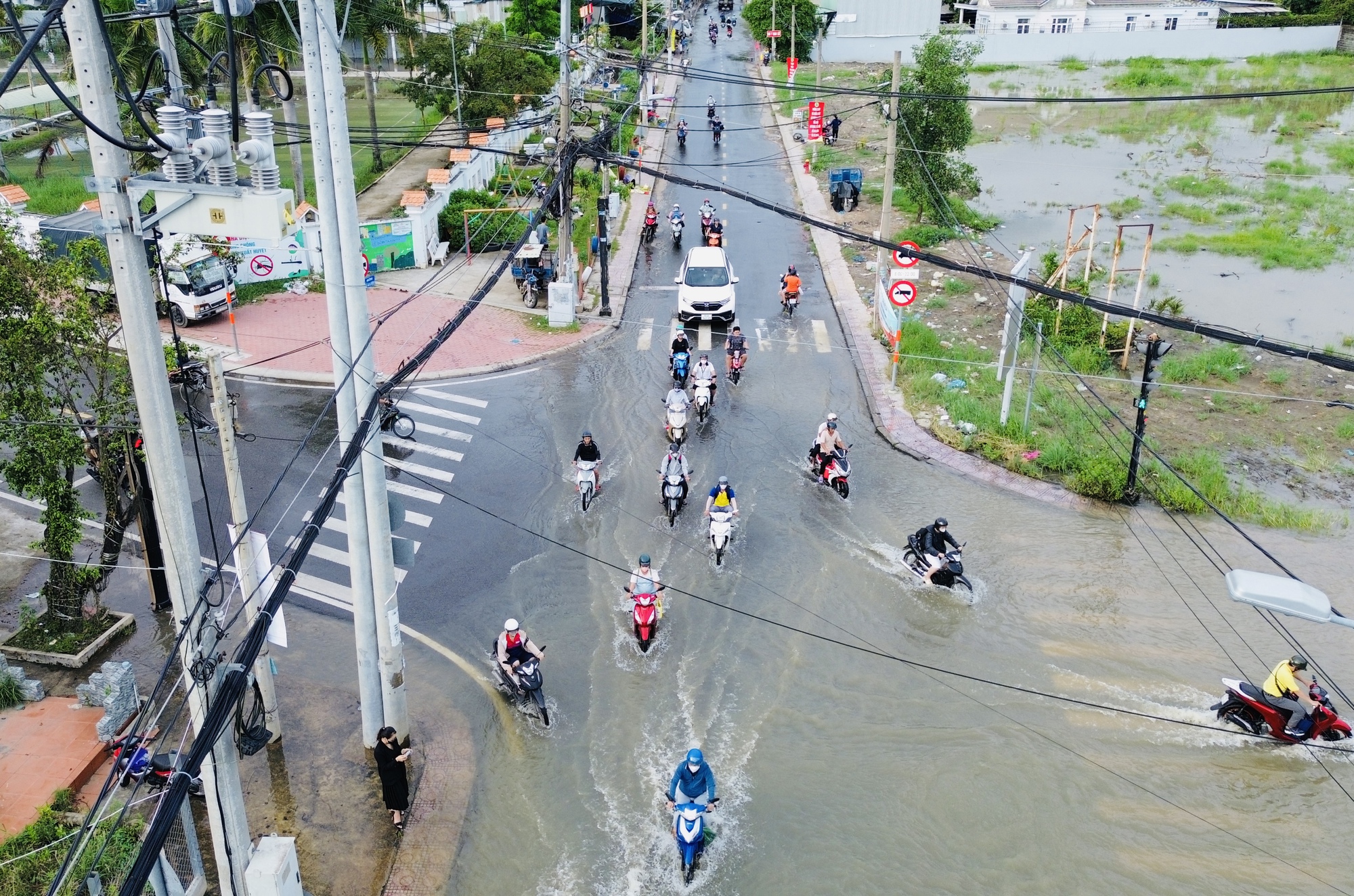Rất nhiều người dân cũng tấp vào ven đường chờ nước rút mới đi về. Những người này hầu hết có chở theo con nhỏ.