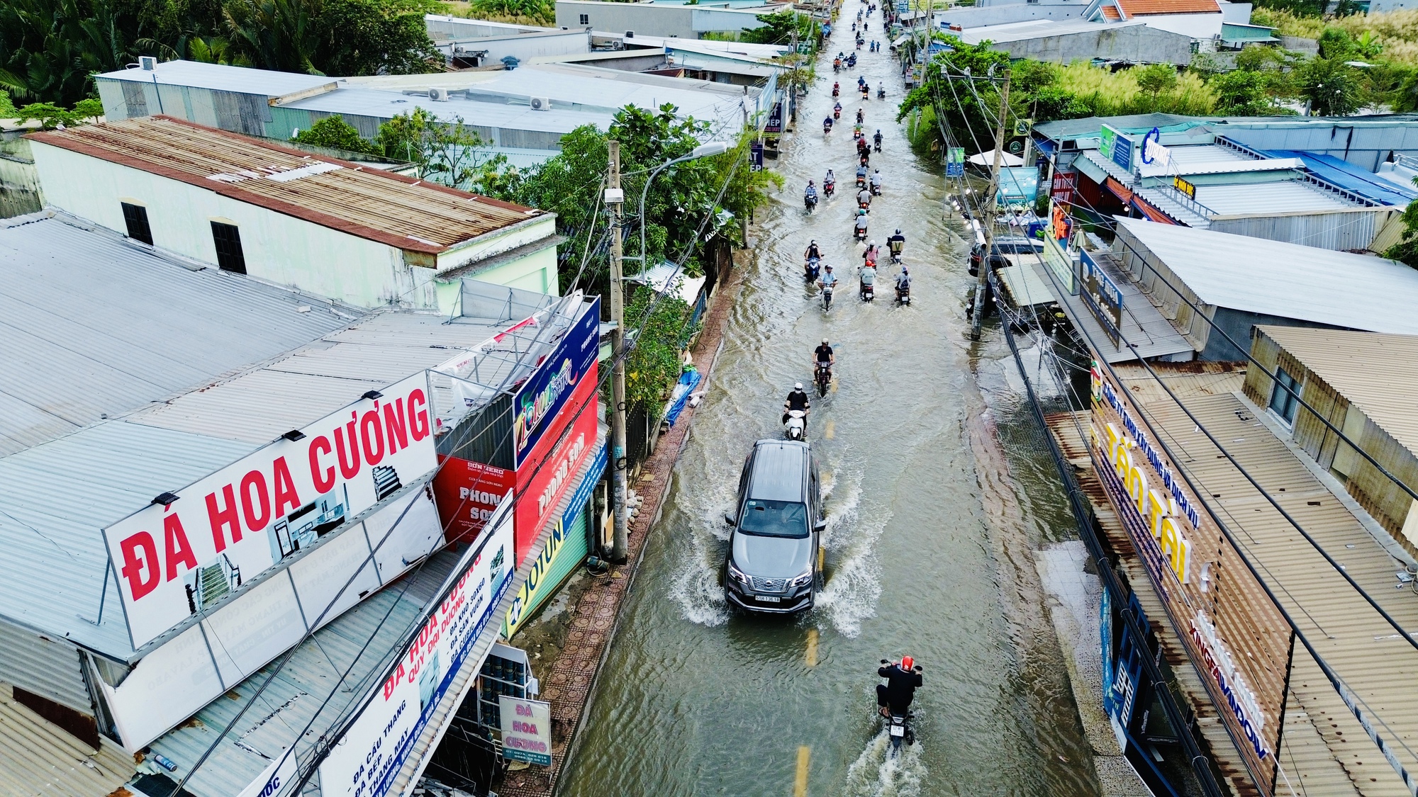 Chỉ sau khoảng 1 giờ đồng hồ, triều cường dâng đạt đỉnh. Thời điểm này, có 10 xe máy đi qua là 9 xe bị tắt máy. Trên chặng đường dài, người dân chật vật, bì bõm dắt xe.
