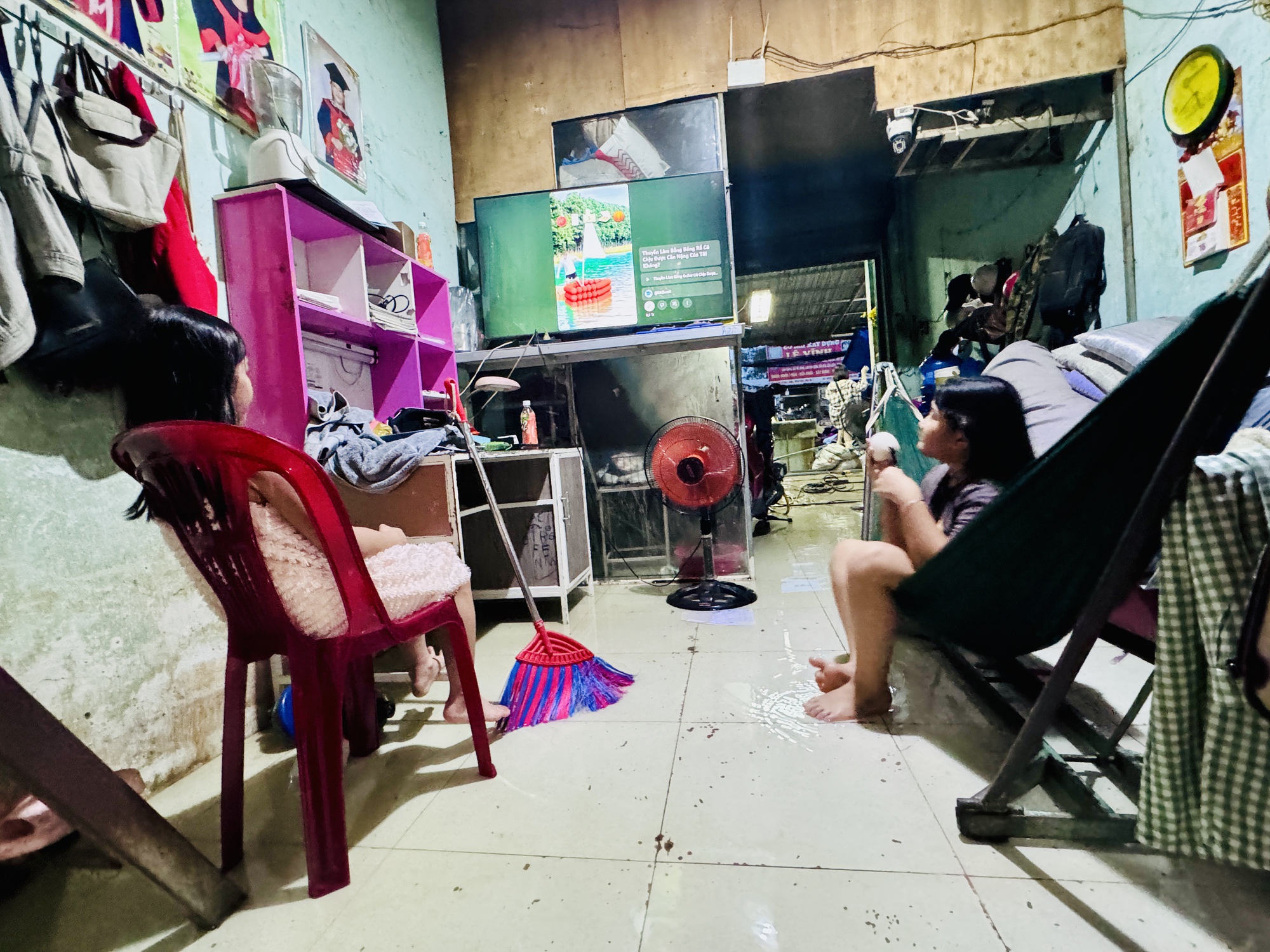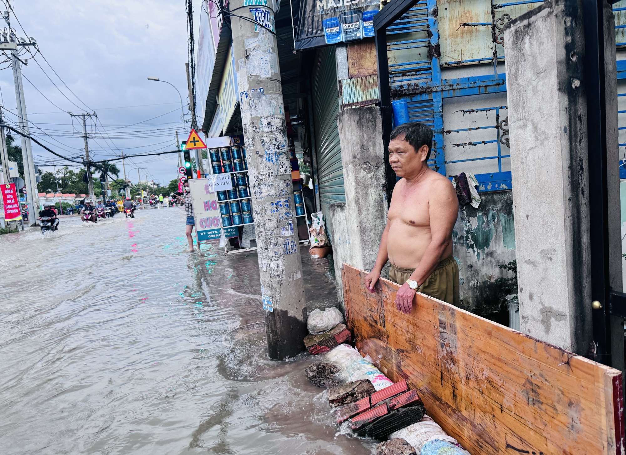 Triều cường bắt đầu dâng cũng là lúc người dân chuẩn bị chèn cửa, cất đồ đạc lên cao, tìm mọi cách ngăn dòng nước tràn vào nhà. "Nước năm nay lên cao lắm, tràn cả vào trong nhà. Nhà tôi bán nệm, hôm trước chủ quan nên nước tràn vào hư mất mấy tấm. Tôi vừa hàn thêm thanh chắn bên trên để ngăn nước", chủ cửa hàng nệm vải Khải Vinh chia sẻ.