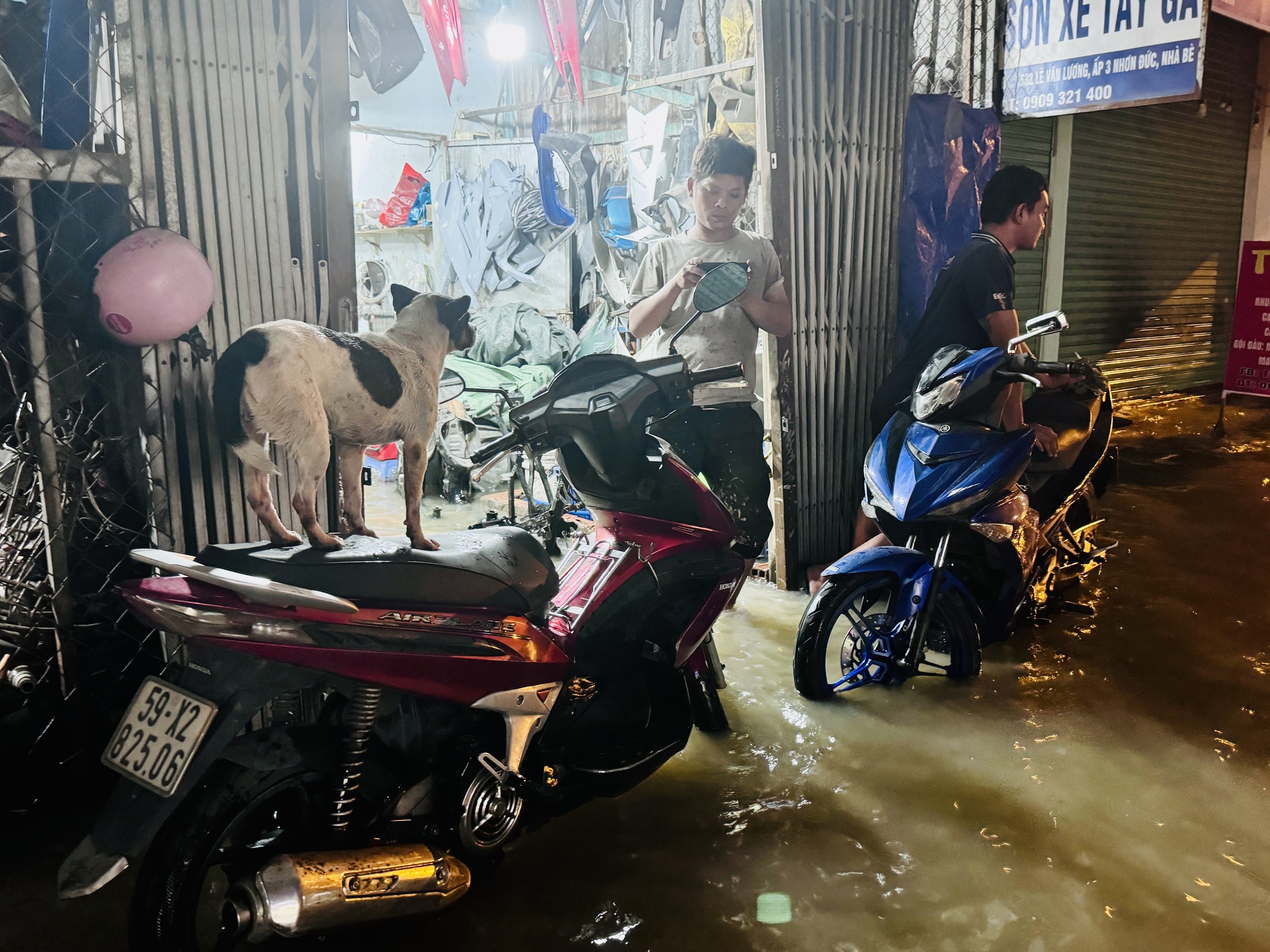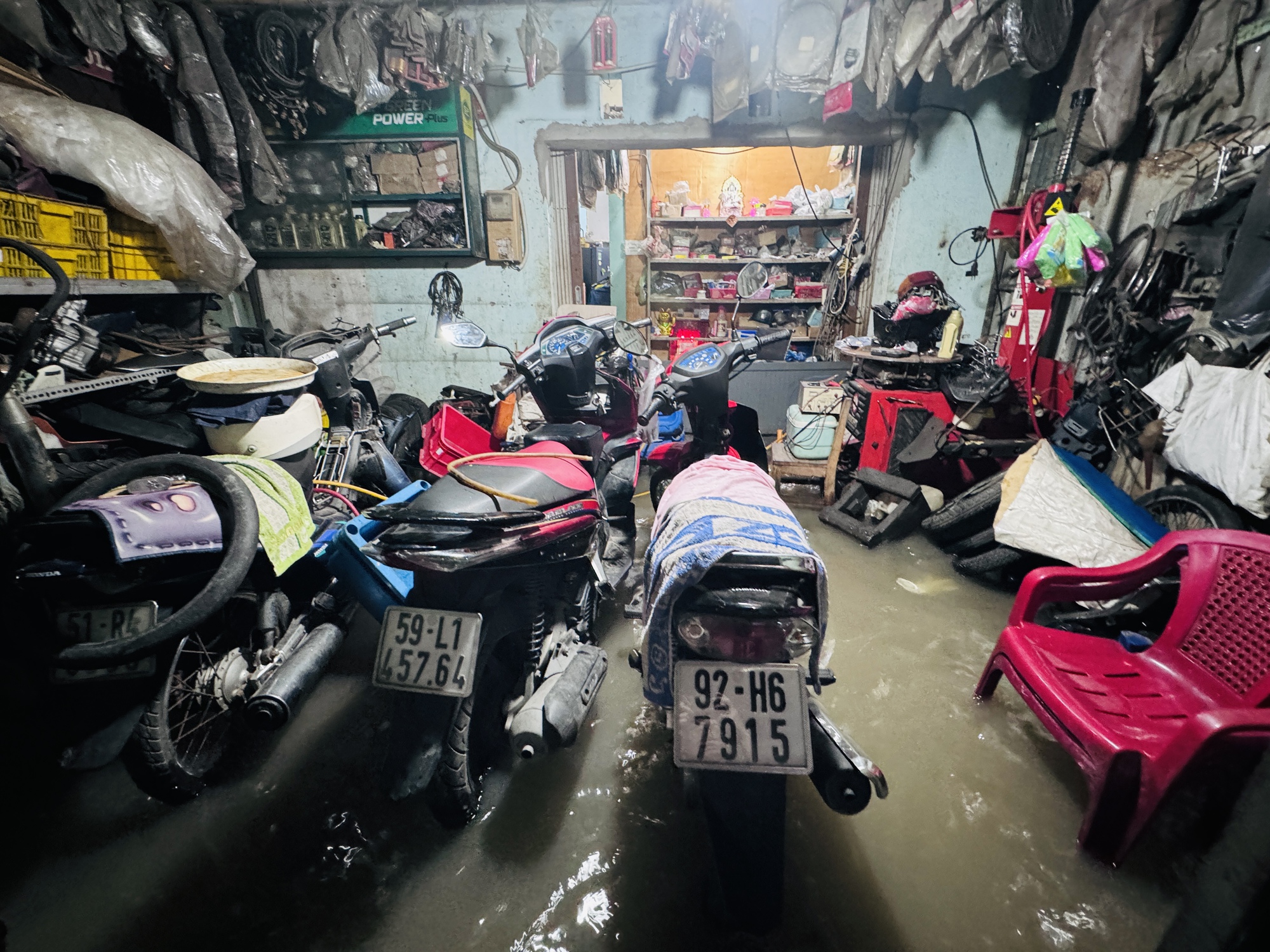 Trong khi đó, anh Nguyên - chủ tiệm xe cho biết, lần nào triều cường đi qua là lần đó đồ đạc bị ẩm mốc, hư hỏng. Thêm vào đó, việc làm ăn kinh doanh cũng đình trệ hoàn toàn. "Triều cường dâng thì xe chết máy, hư hỏng phải sửa nhiều nhưng tiệm mình cũng ngập, nước tràn khắp nơi, lấy đâu ra chỗ mà sửa chữa", anh Nguyên ngán ngẩm.