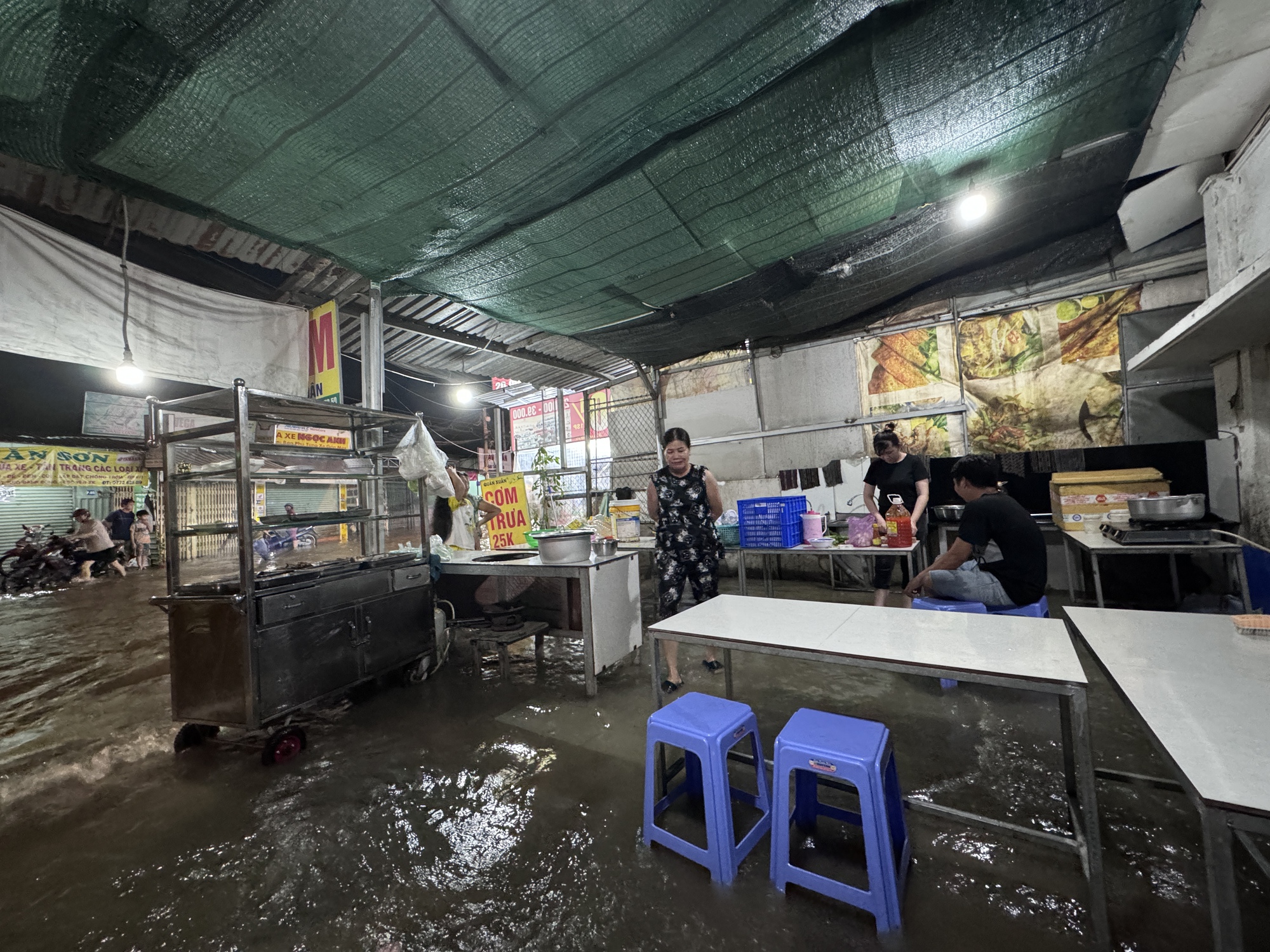 Ở cạnh đó, quán cơm bình dân vắng lặng, đìu hiu không một bóng khách. Chủ quán và nhân viên ngồi nhìn nhau chờ nước rút. Anh Tâm, chủ quán cơm cho biết, thông thường khoảng 18h30 là quán đông khách, đồ ăn cũng vơi dần. Đến khoảng 19h gần như việc buôn bán hoàn tất. "Những ngày triều dâng chúng tôi đã nấu ít lại nhưng vẫn ế ẩm, không có một bóng khách", anh Tâm nói.