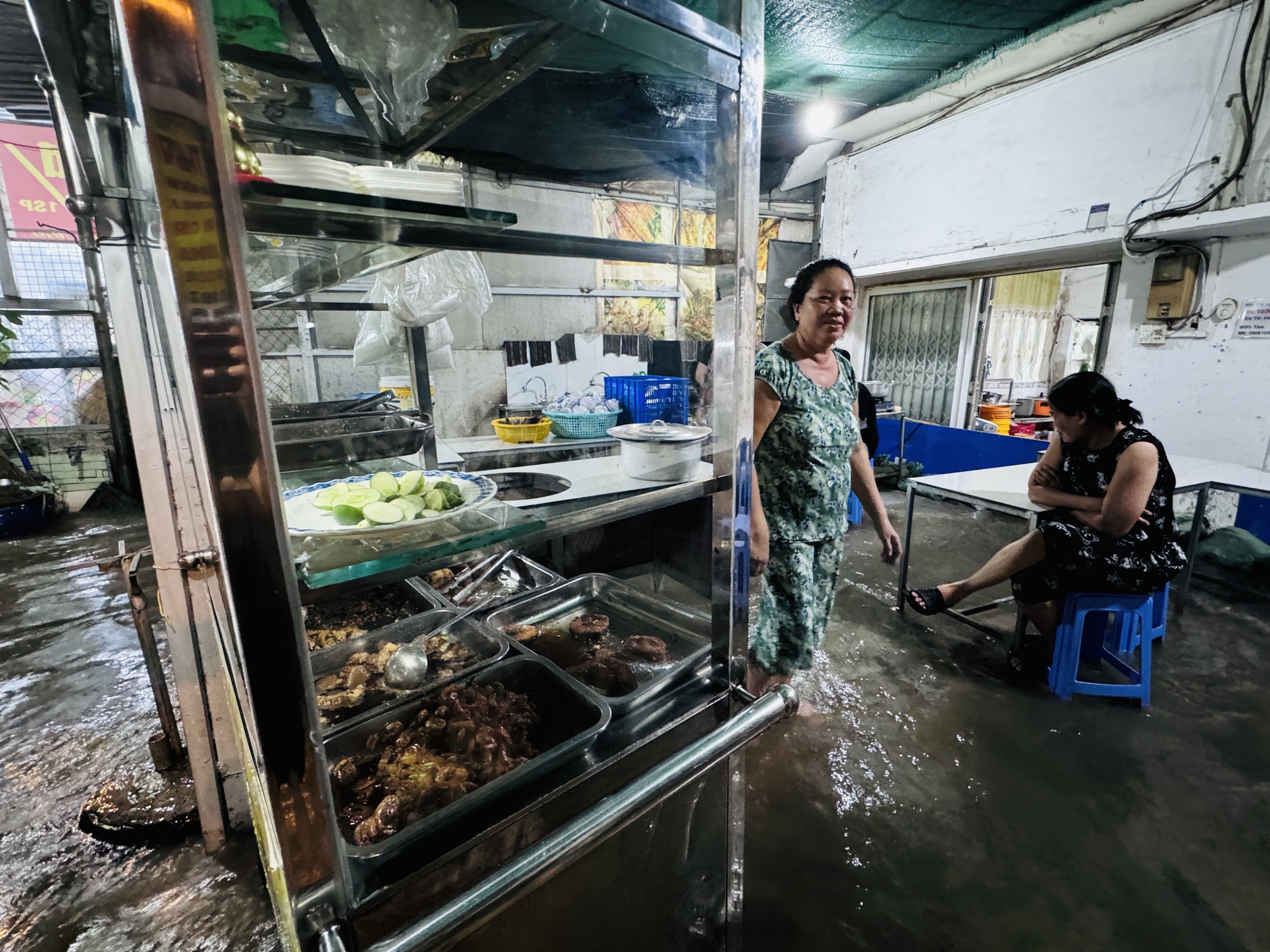 Trong ảnh, những khay đồ ăn còn khá nhiều vì khách không ghé ăn cơm do triều cường dâng cao. Chủ quán cho biết, số thức ăn không bán được này sẽ chia cho bà con xóm giềng ăn phụ hoặc không thì phải đổ bỏ.