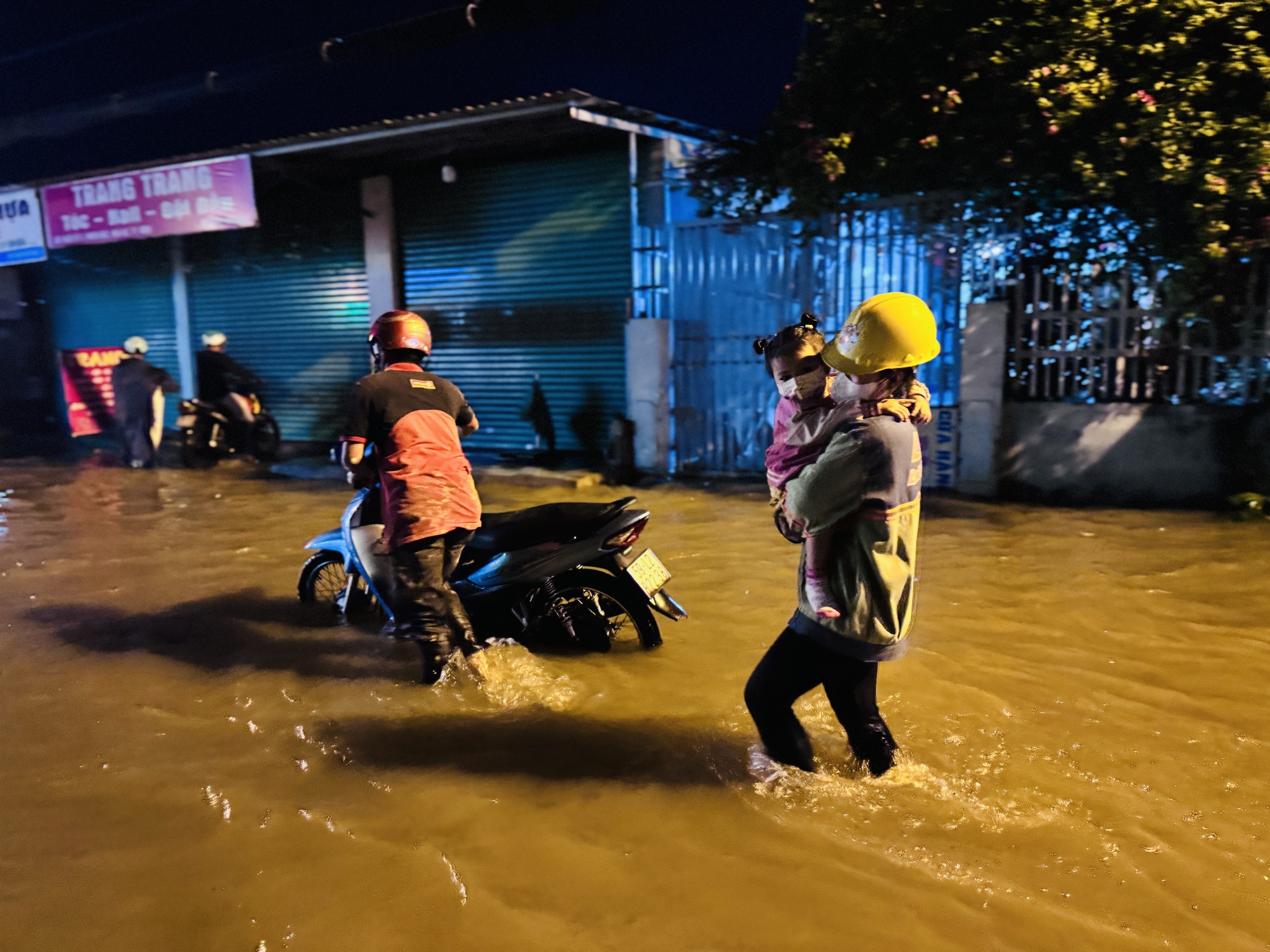 Nhiều cặp vợ chồng đón con nhỏ sau giờ làm việc cũng bất lực lội bộ giữa dòng nước.