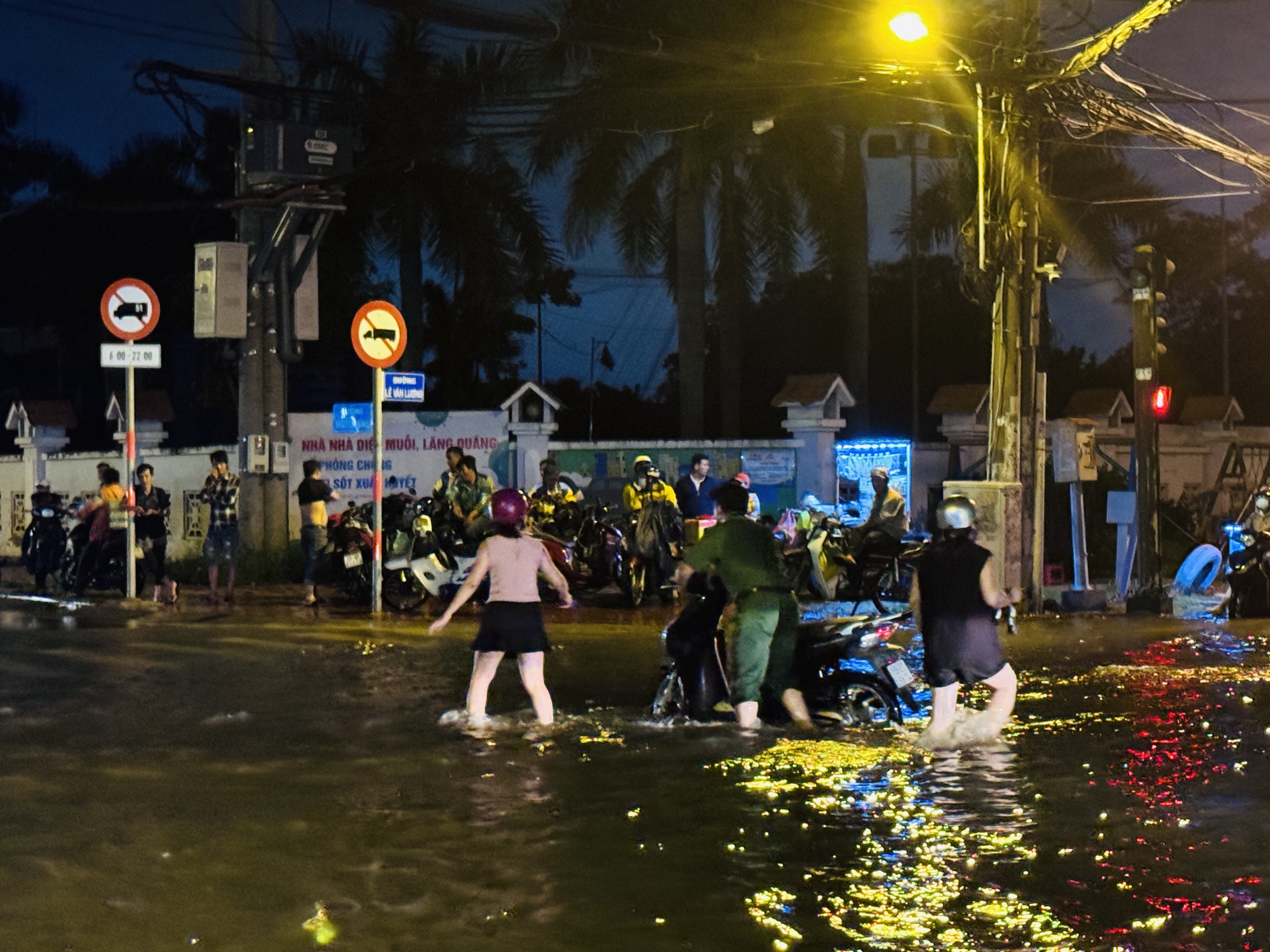 Tại giao lộ Lê Văn Lương - Nguyên Bình, các chiến sĩ CSGT và công an túc trực, hỗ trợ người dân bị hư xe hoặc di chuyển khó khăn vượt qua dòng nước.