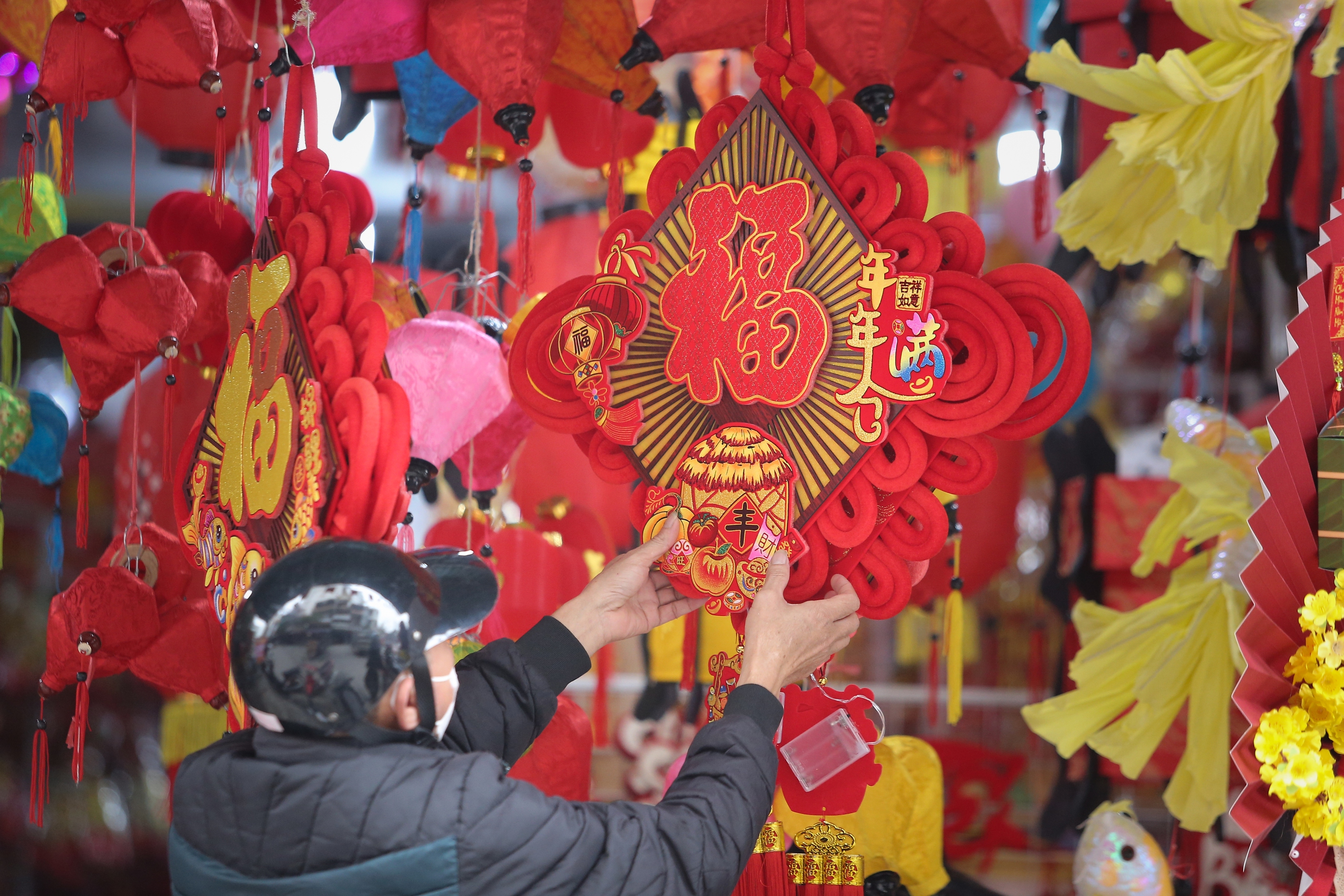 Dọc phố này, phần đông cửa hàng đều bán đồ trang trí như câu đối, đèn lồng, đèn nháy, các loại hoa đào, hoa mai giả…