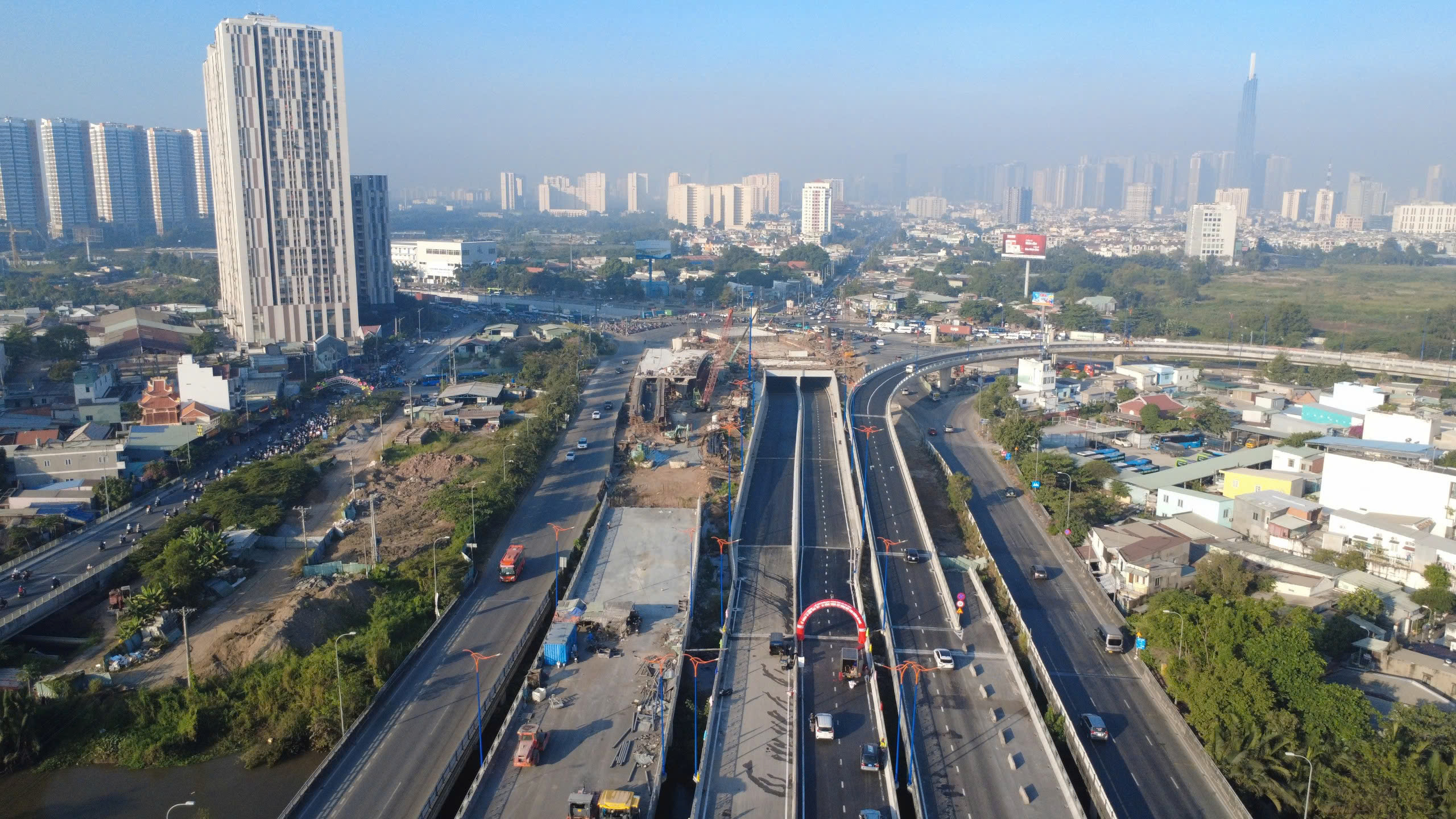 Tại khu Đông TP.HCM, nút giao An Phú - điểm nóng ùn tắc nhiều năm - đang được tập trung nguồn lực để sớm hoàn thiện. Các hạng mục cầu vượt, hầm chui và đường kết nối được triển khai đồng bộ; đến nay đã thông xe một số hầm chui và nhánh cầu vượt quan trọng.