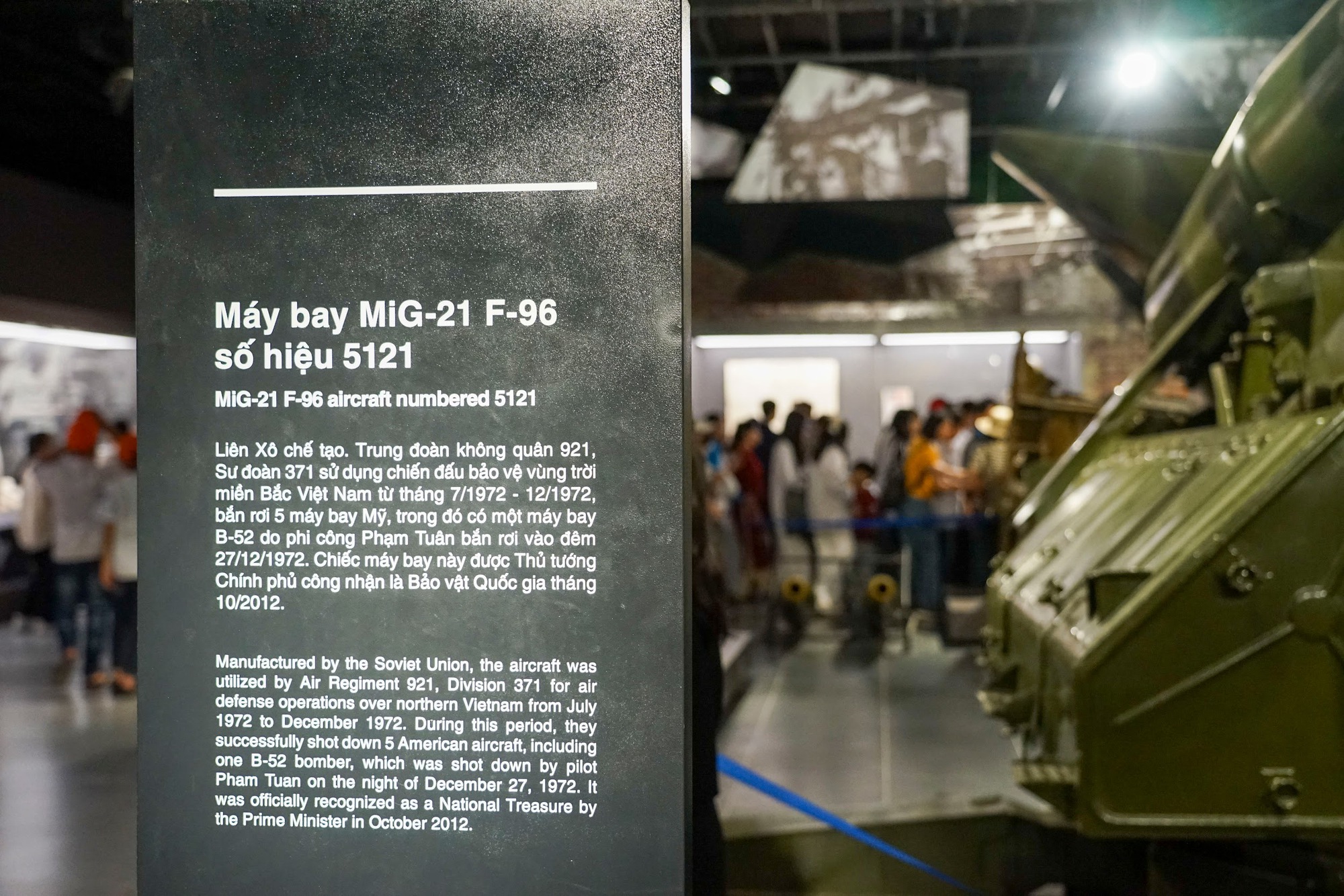 Một trong những hiện vật gây ấn tượng mạnh là chiếc máy bay MiG-21 F-96, số hiệu 5121, được sản xuất tại Liên Xô, thuộc Trung đoàn Không quân 921, Sư đoàn 371. Máy bay này đã tham gia bảo vệ vùng trời miền Bắc Việt Nam từ tháng 7/1972 đến tháng 12/1972, bắn rơi 5 máy bay Mỹ, trong đó có một máy bay B-52 do phi công Phạm Tuân bắn rơi vào đêm 27/12/1972.