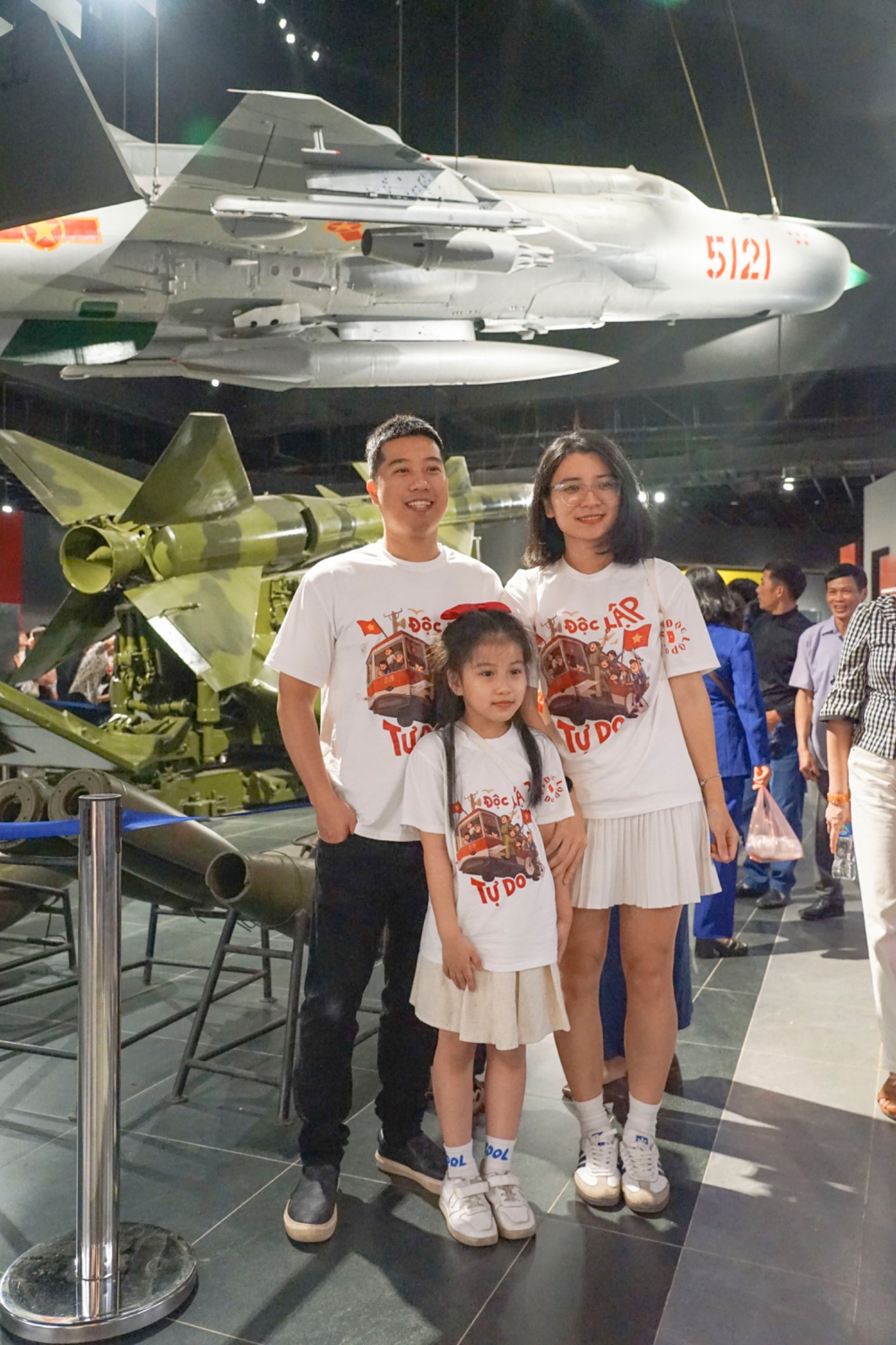 Một gia đình mặc áo in dòng chữ "Độc lập - Tự do" chụp ảnh lưu giữ khoảnh khắc ý nghĩa bên bảo vật quốc gia tại bảo tàng trước thềm kỷ niệm 30/4.
