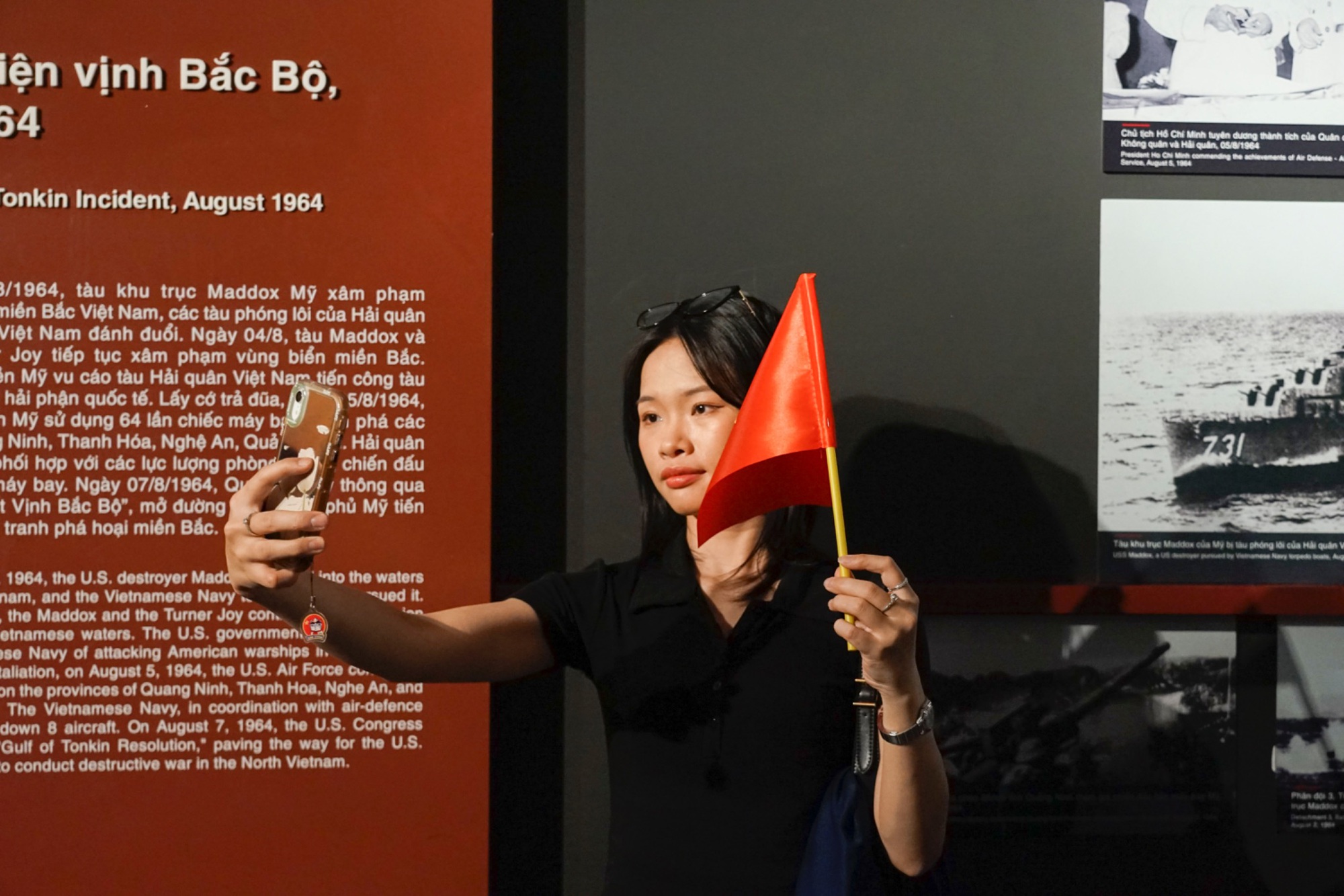 Nhiều bạn trẻ còn mang theo quốc kỳ để thể hiện niềm tự hào khi check-in cùng các hiện vật lịch sử trước dịp 30/4.
