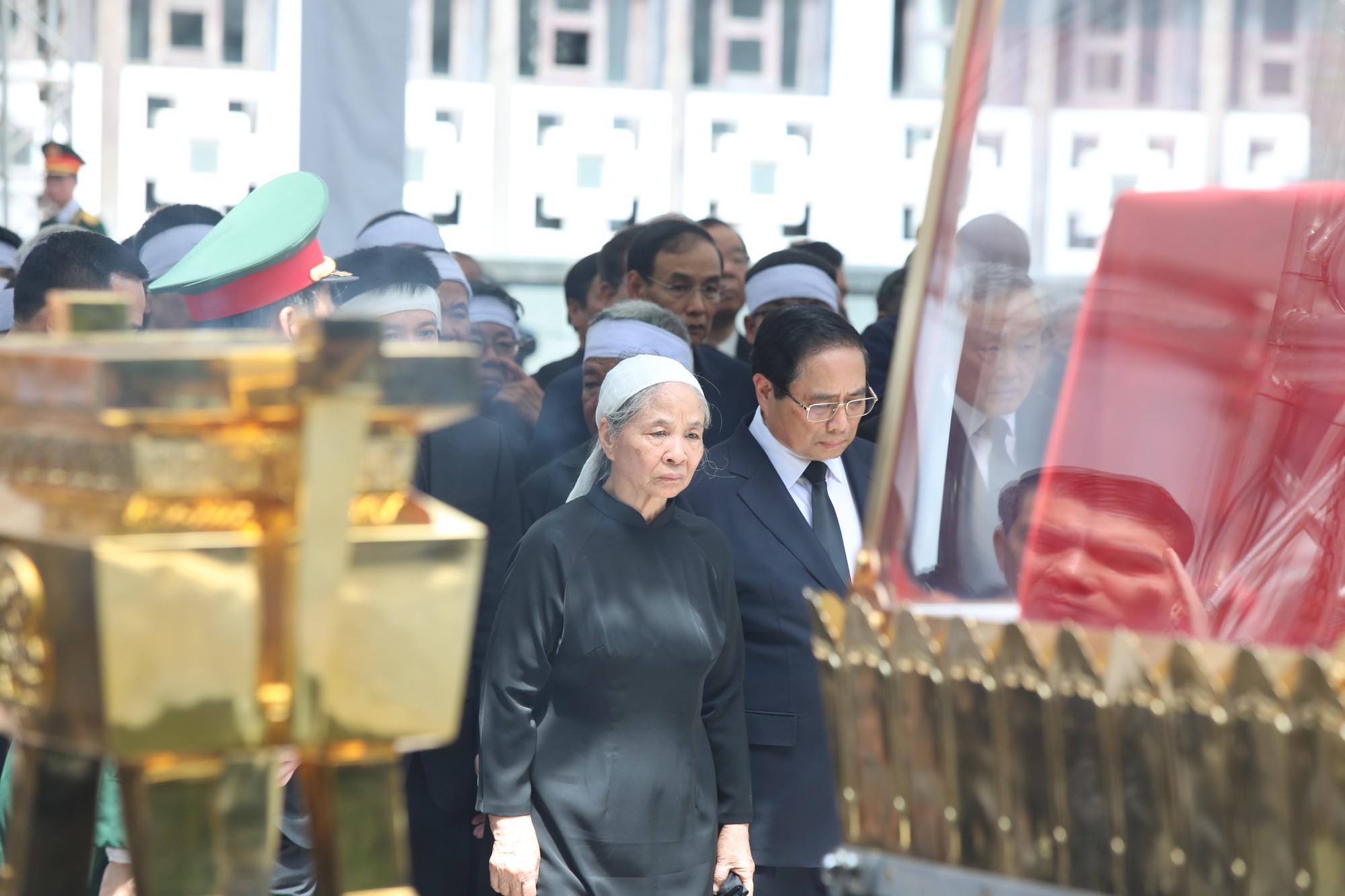 Sau lời cảm tạ của con trai Tổng Bí thư, bà Ngô Thị Mận, phu nhân Tổng Bí thư Nguyễn Phú Trọng dẫn đầu đoàn gia quyến đi vòng quanh linh cữu, tiễn biệt ông lần cuối. Bà chắp tay trước linh cữu ông, rơi nước mắt trước di ảnh chồng.