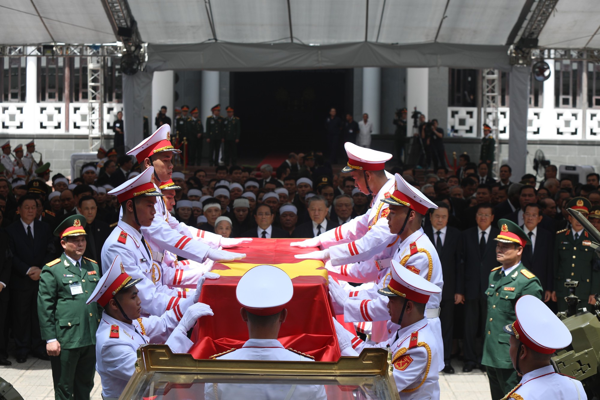 Sau khi Chủ tịch nước Tô Lâm đọc điếu văn, lãnh đạo, nguyên lãnh đạo Đảng, Nhà nước, các vị khách quốc tế, đồng bào và gia đình có mặt tại Nhà tang lễ Quốc gia dành một phút mặc niệm Tổng Bí thư Nguyễn Phú Trọng.