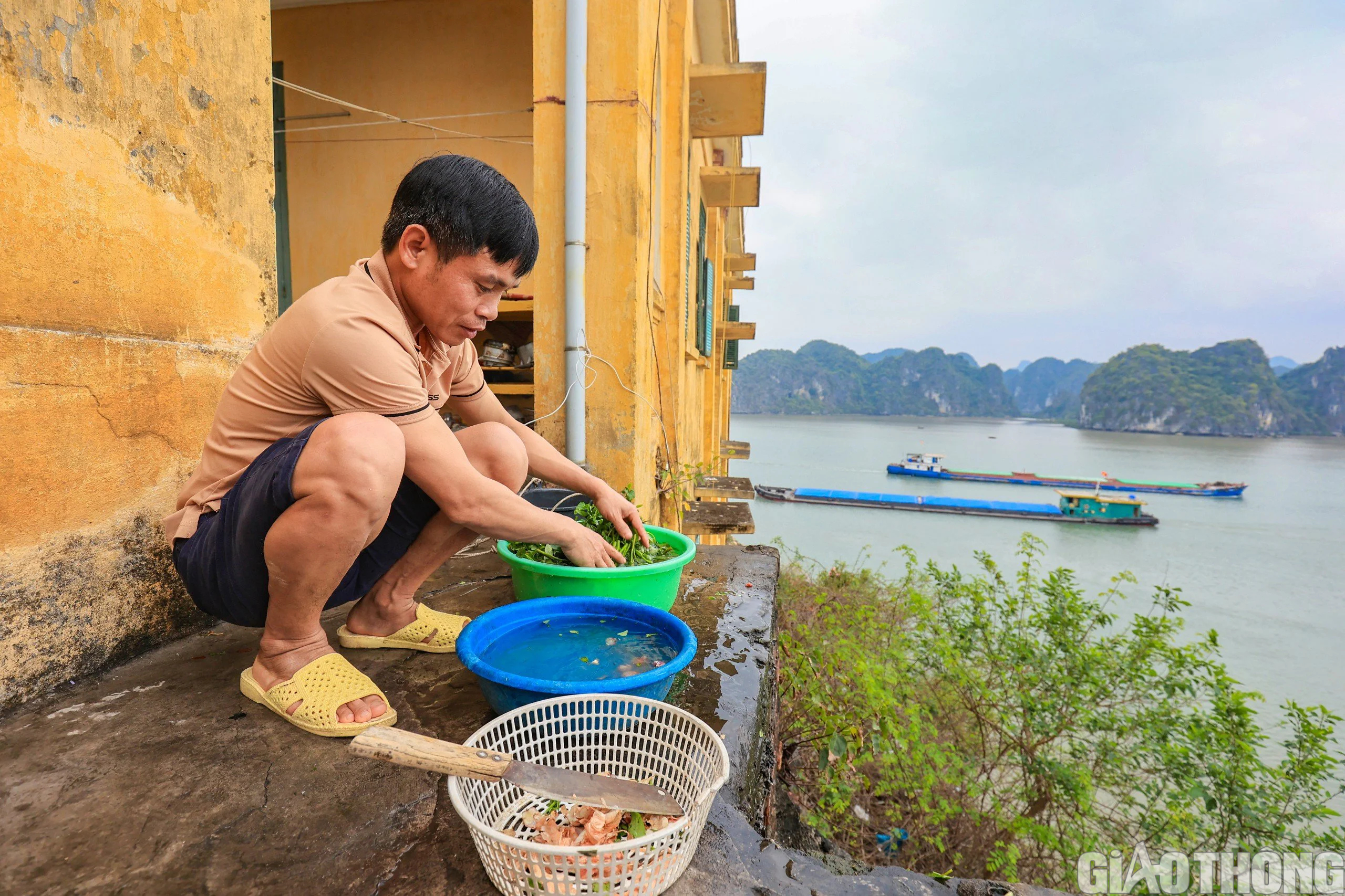 Theo lời anh Hoàng Triều Dương, công nhân trạm, do đảo đá nên đôi khi các tàu khó cập vào bờ. Anh em trạm thường phải dùng thuyền mủng nhỏ, chèo tay để "tăng bo" lấy đồ ăn mang lên trạm. "Ở đây ai cũng biết nấu cơm. Do việc mang thực phẩm ra đây khó khăn nên anh em cũng chỉ nấu những món đơn giản. Nguồn thực phẩm dồi dào nhất chủ yếu là hàu vì chúng tôi có thể mua của các hộ nuôi bè ngay bên cạnh", anh Dương cười (Trong ảnh: Ông Tính, anh Dương chèo thuyền mủng "tăng bo" thực phẩm).