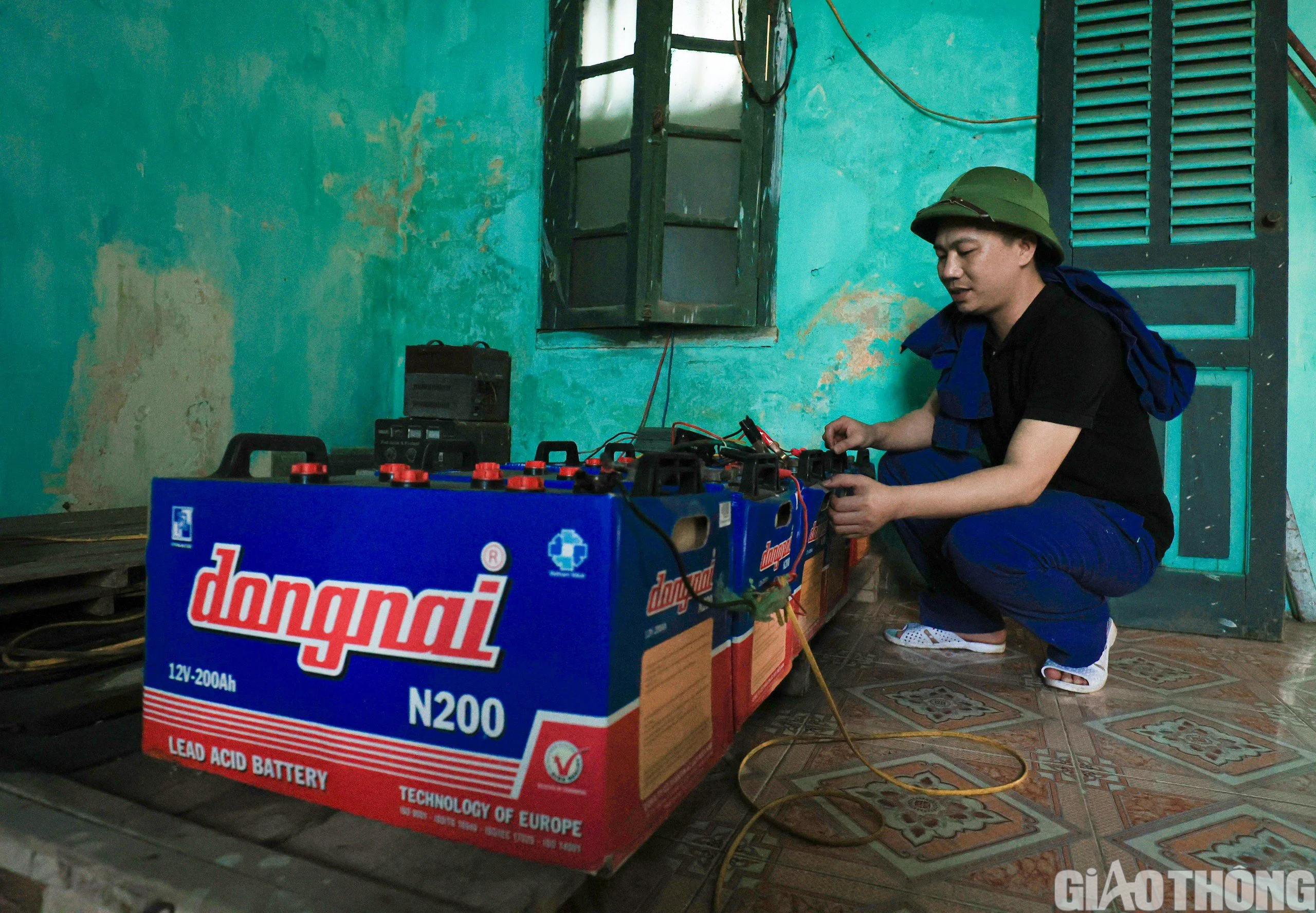Điện thì dùng hệ thống điện mặt trời nạp vào ắc-quy, cũng chủ yếu để thắp đèn tín hiệu ban đêm và đèn điện. Nếu mưa, hoặc không còn điện ắc-quy thì dùng máy phát điện, nhưng rất hạn chế vì phải theo định mức về nhiên liệu. Vì thế, trong điều kiện thời tiết bình thường, sóng yên biển lặng sẽ không có vấn đề gì lớn, nhưng mùa mưa bão, hay mưa dầm gió bấc, sẽ khó khăn cả trong thực hiện nhiệm vụ và điều kiện sinh hoạt. Chưa kể, từ tháng 3 âm lịch đến hè, hay những ngày nước kém, trên đảo có rất nhiều con dĩn li ti, chi chít, nên thường xuyên phải đốt hương muỗi, có hôm ban ngày mà phải mắc màn, ngồi ở trong tránh dĩn (Trong ảnh: Hệ thống ắc-quy chỉ để dùng duy trì đèn báo hiệu, đèn thắp sáng).